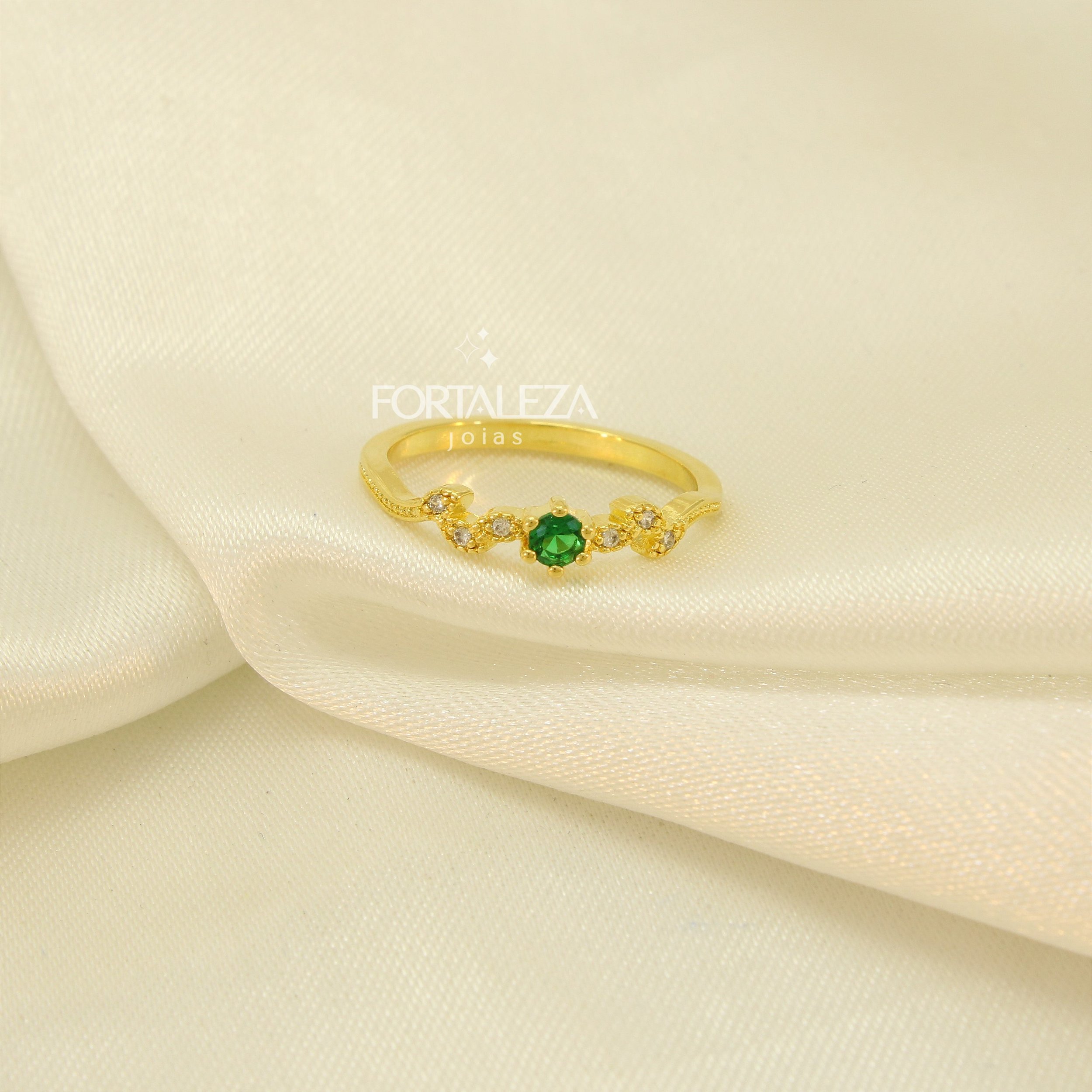 Anel com Detalhe de Folhas Trabalhado em Zircônia Esmeralda e Cristal Banhado a Ouro 18k