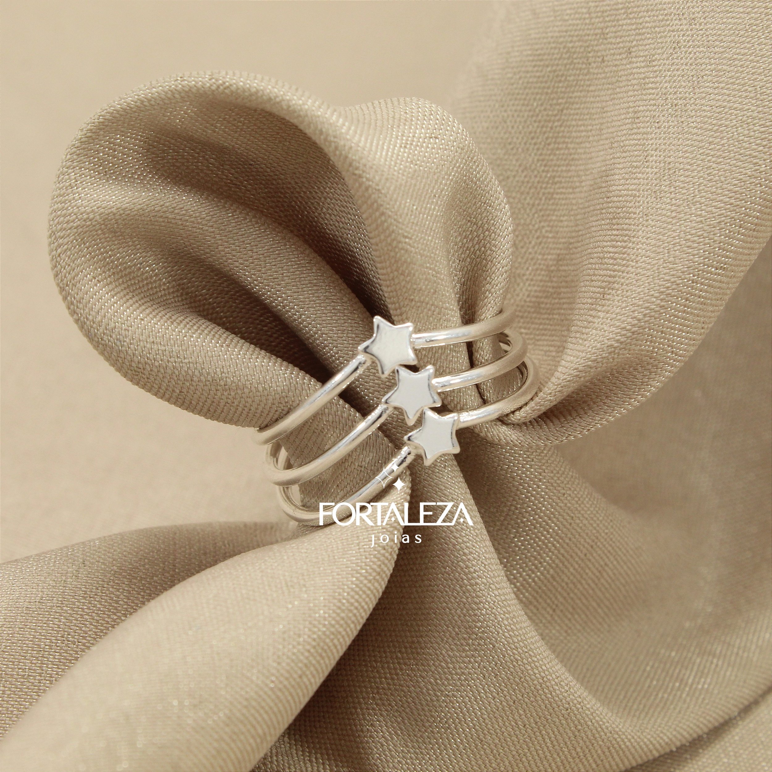 Anel de Aro Triplo com Detalhes de Estrelas Banhado a Prata