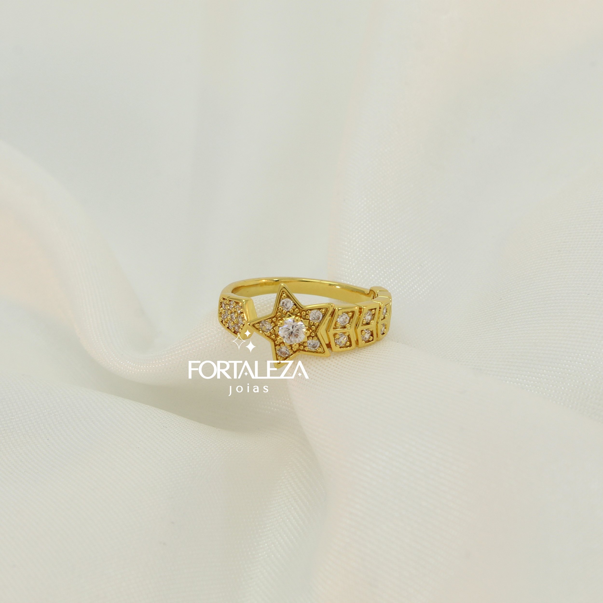 Anel Regulável de Estrela Cravejada em Zircônia Cristal Banhado a Ouro 18k