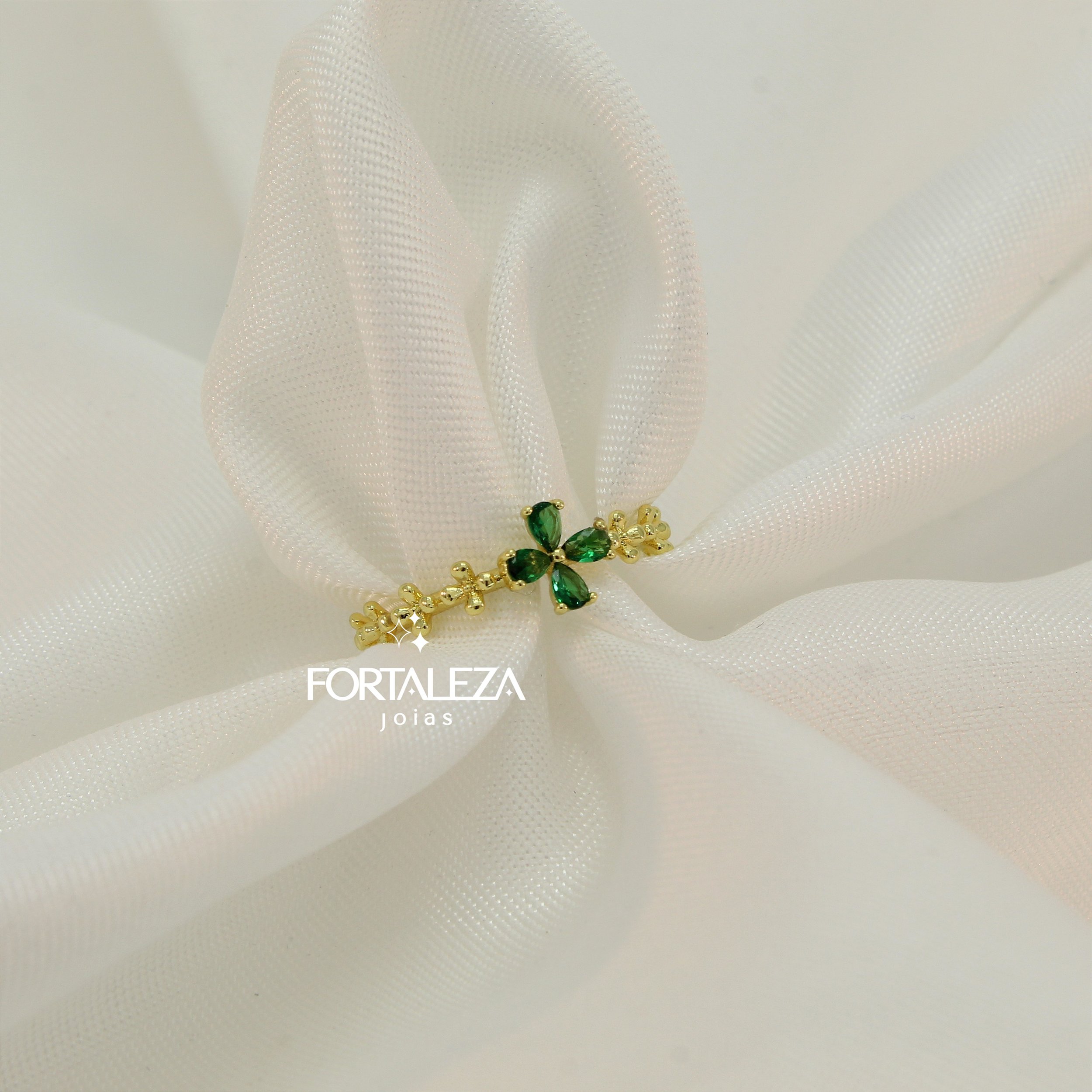Anel Regulável com Design de Flores com Zircônia Esmeralda Banhado a Ouro 18k