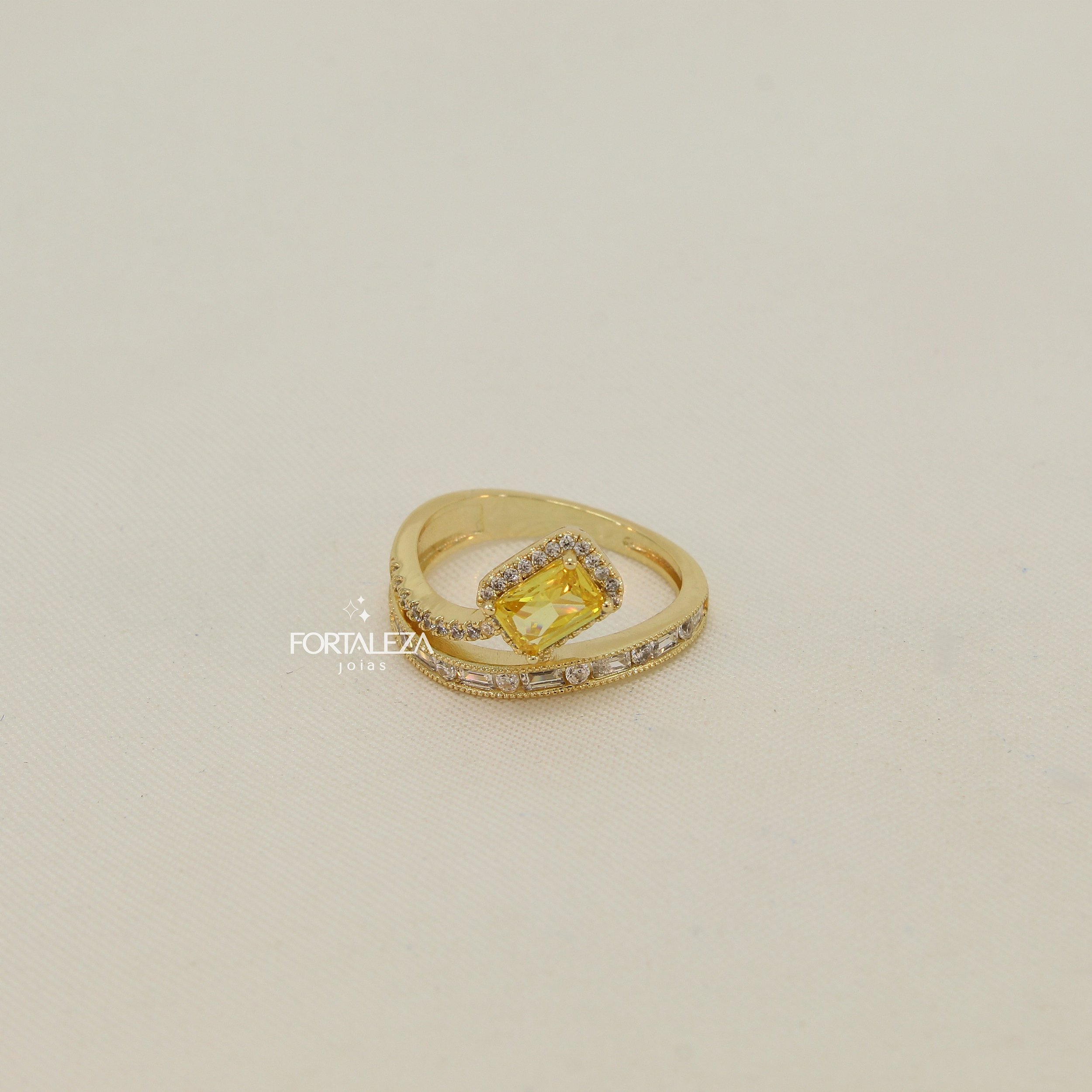 Anel Cravejado com Micro Zircônia Cristal e Safira Amarela Banhado a Ouro 18k