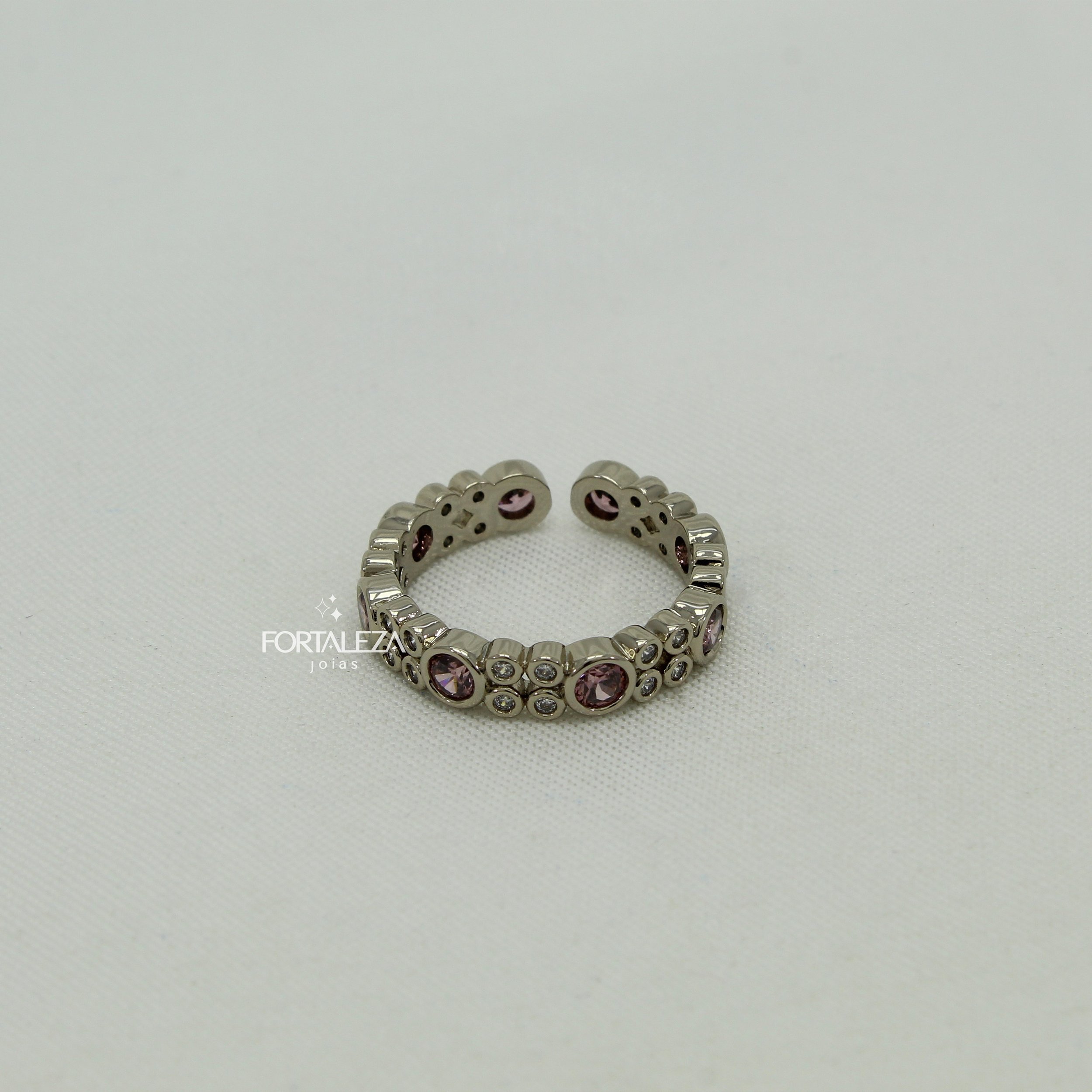 Anel Cravejado com Zircônia Safira Rosa Banhado em Ródio