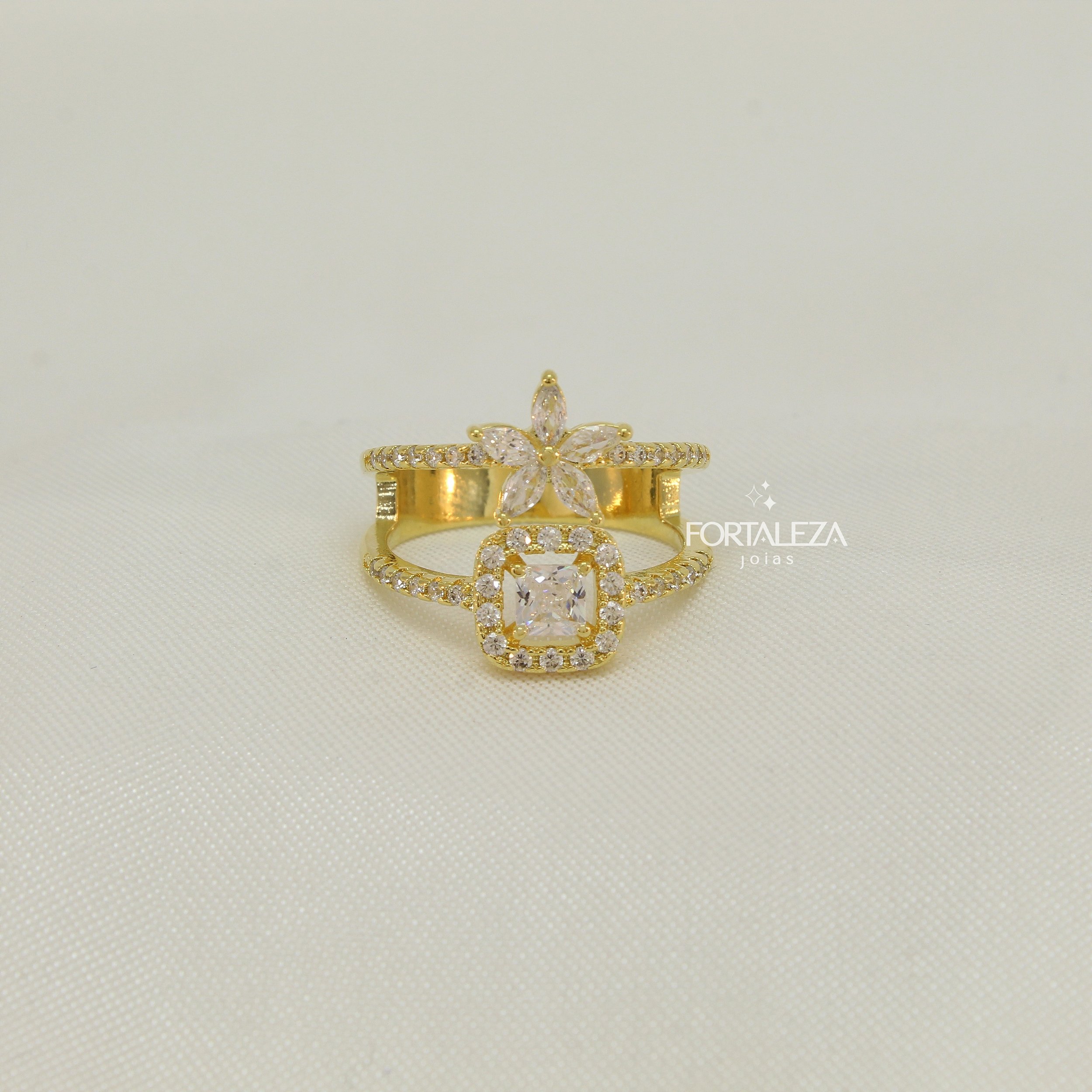 Anel Duplo Quadrado e Flor Cravejado em Zircônia Cristal Banhado a Ouro 18k