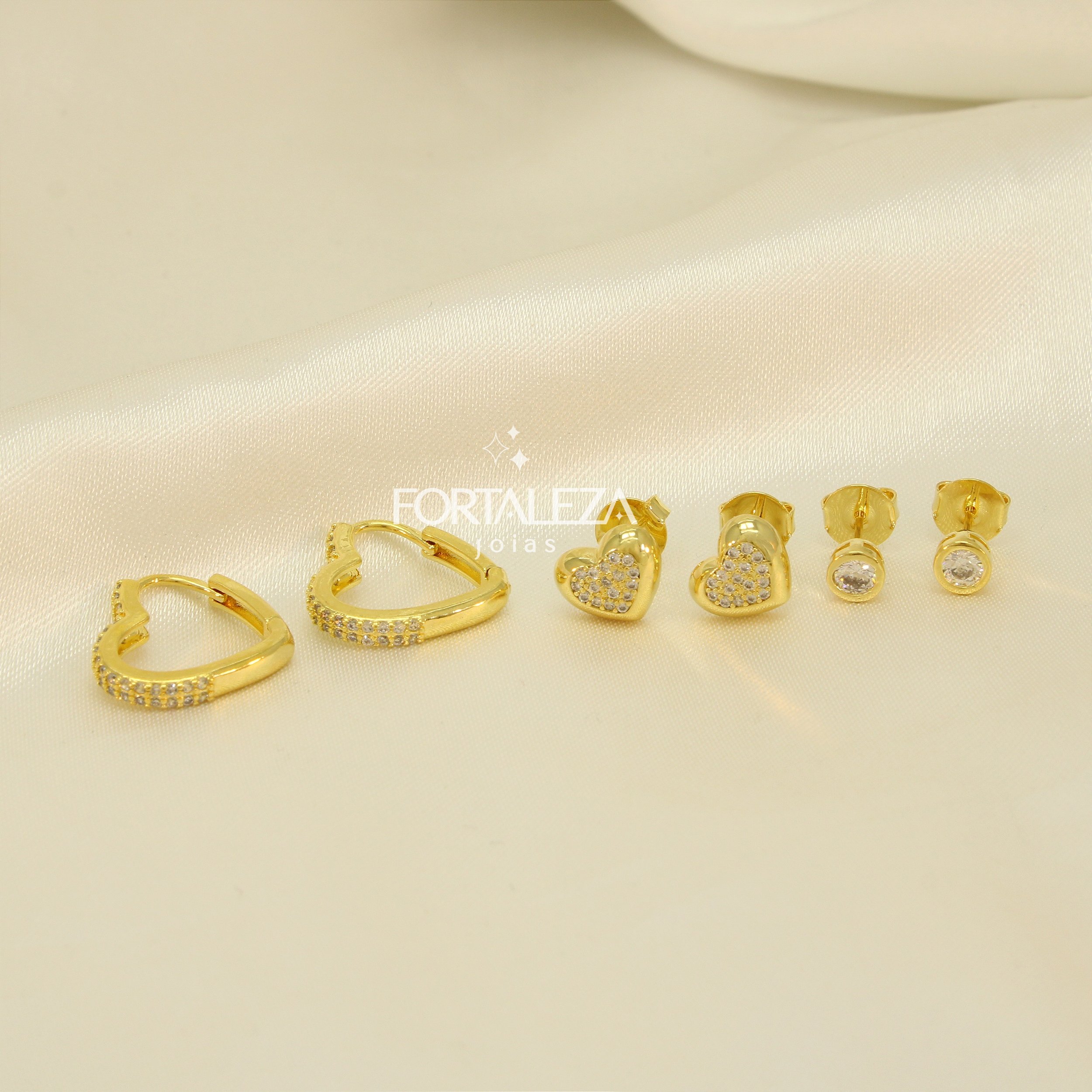Brinco em Trio Coração com Argola Cravejado em Zircônia Cristal Banhado a Ouro 18k