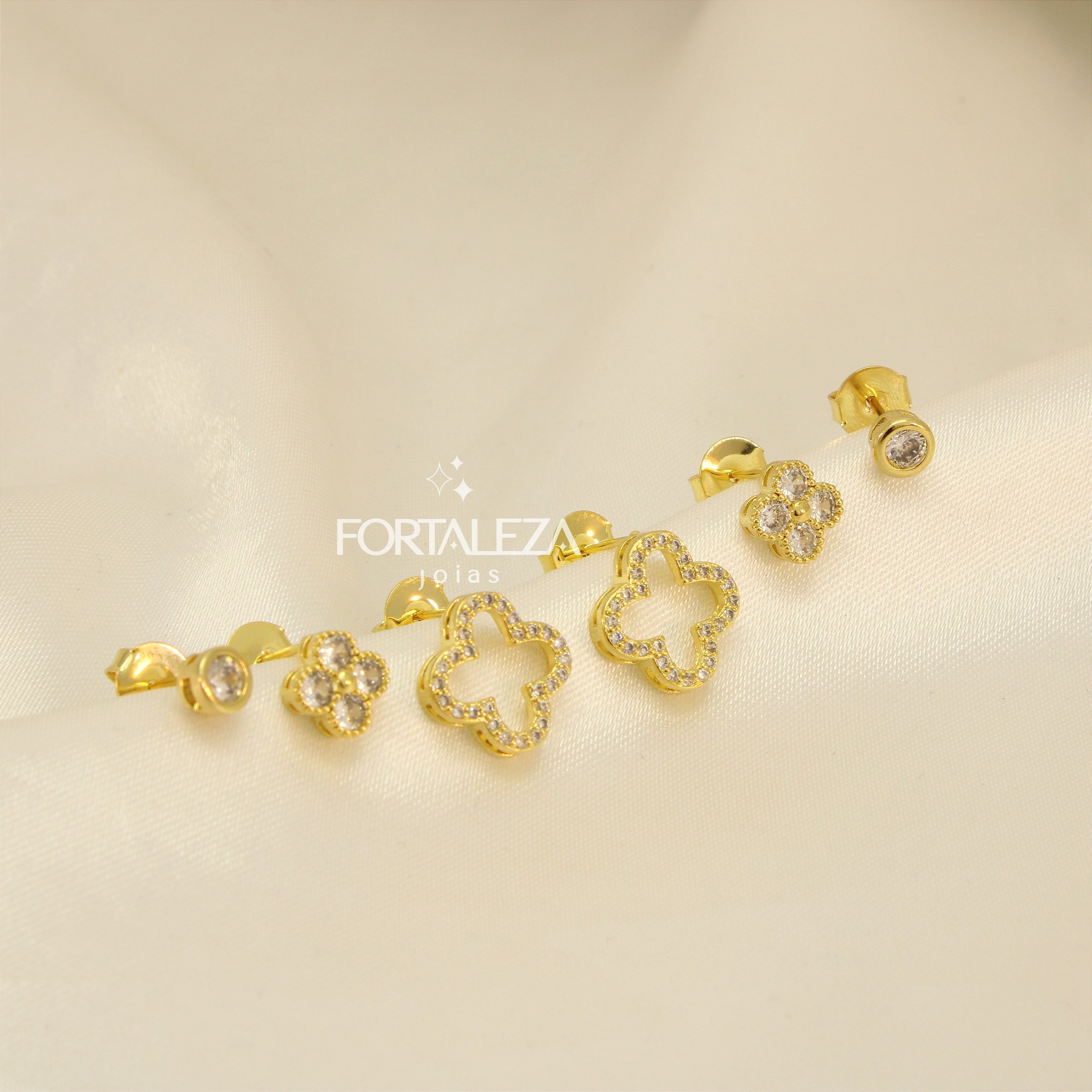 Brinco em Trio com Trevo Cravejado em Zircônia Cristal Banhado a Ouro 18k