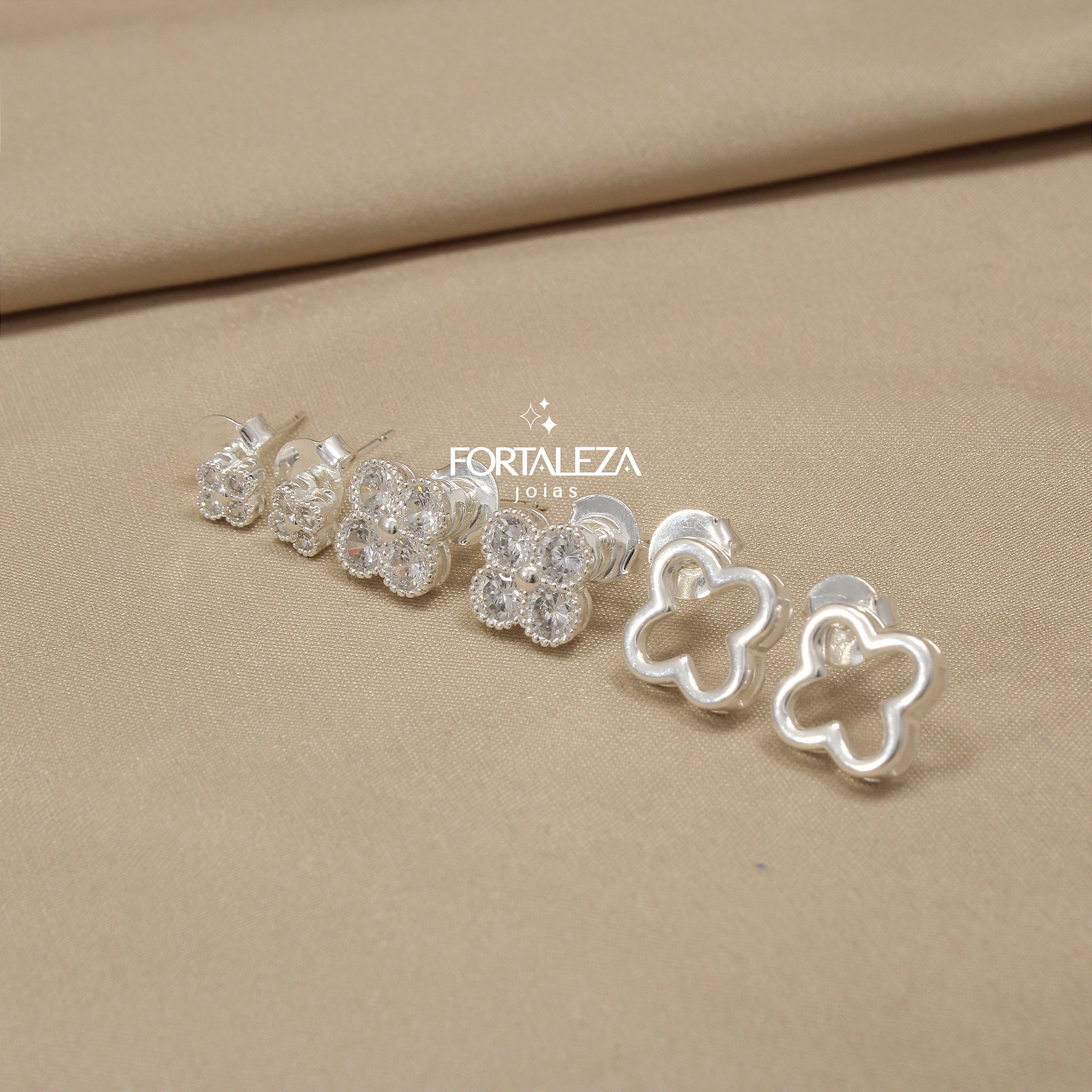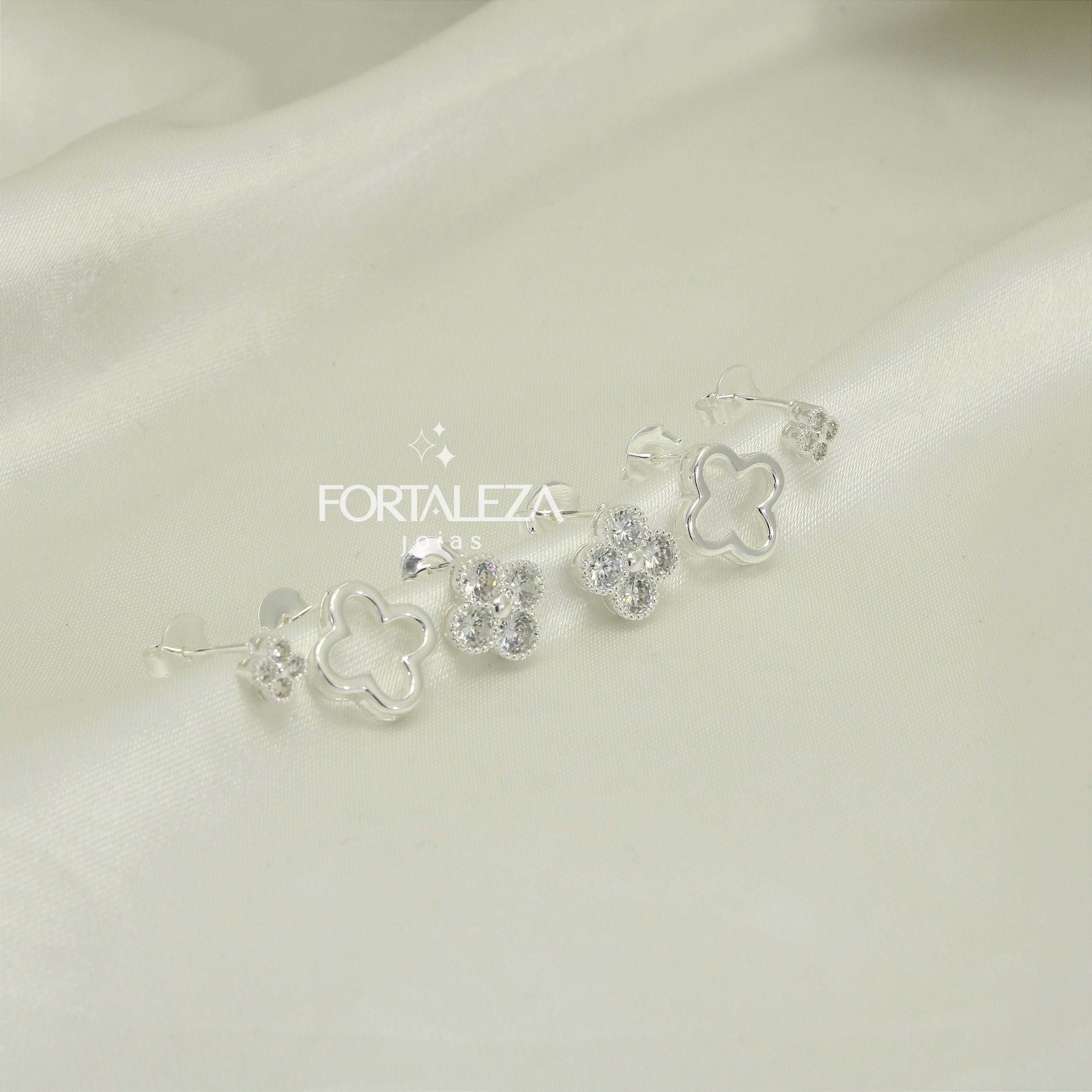 Brinco em Trio com Trevo Cravejado e Banhado a Prata 925