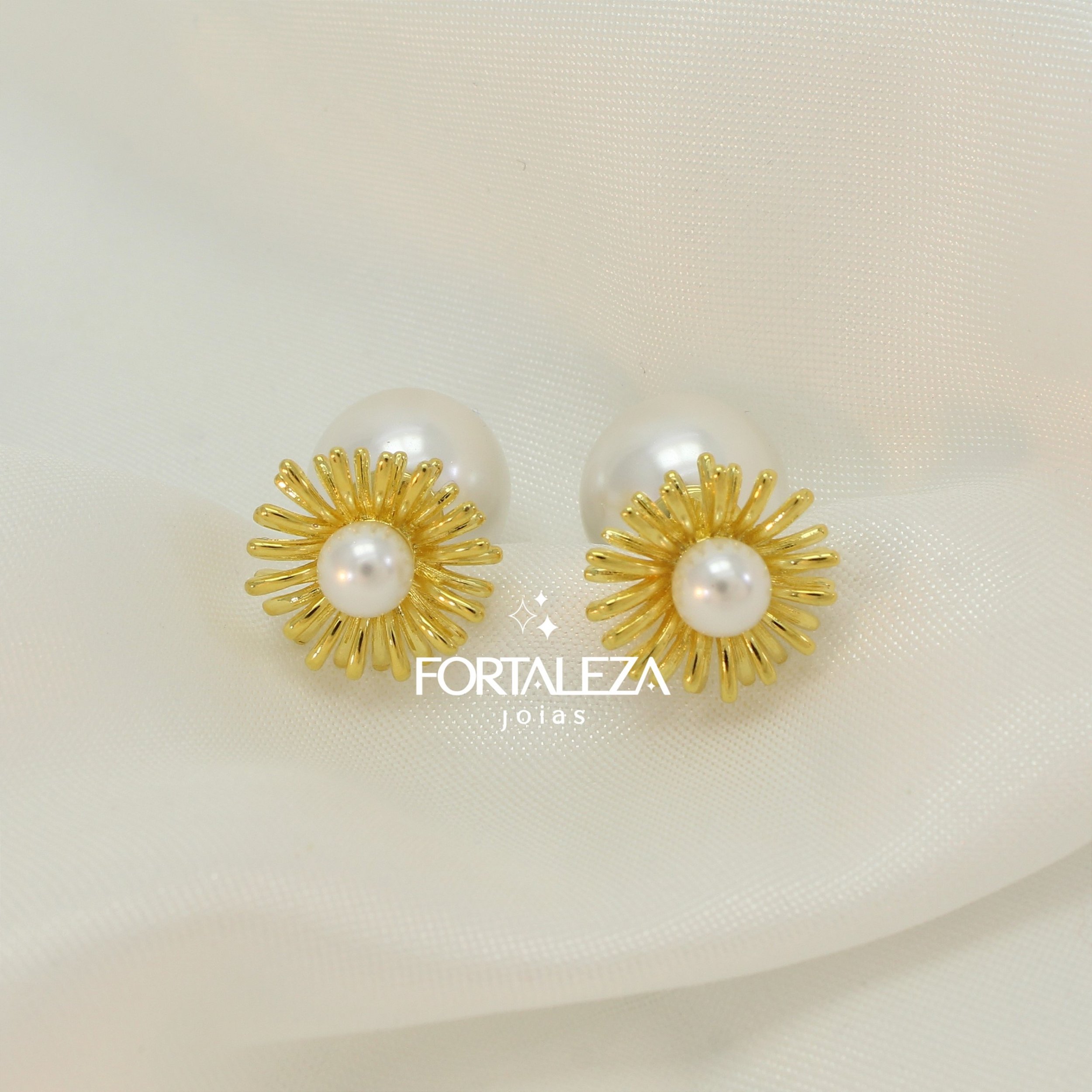Brinco Ear Jacket de Flor com Pérola Banhado a Ouro 18k