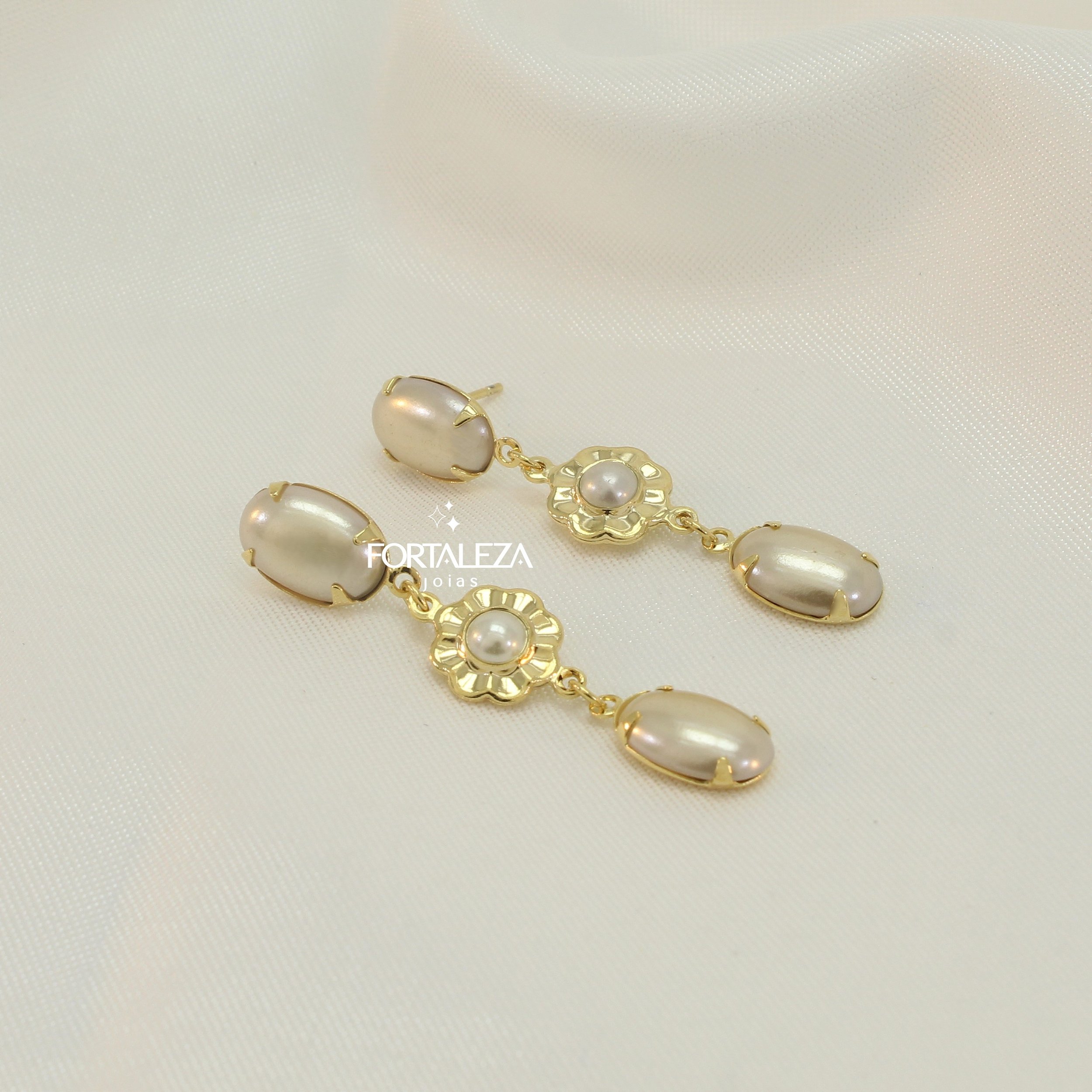 Brinco de Pérolas com Flor Banhado a Ouro 18k