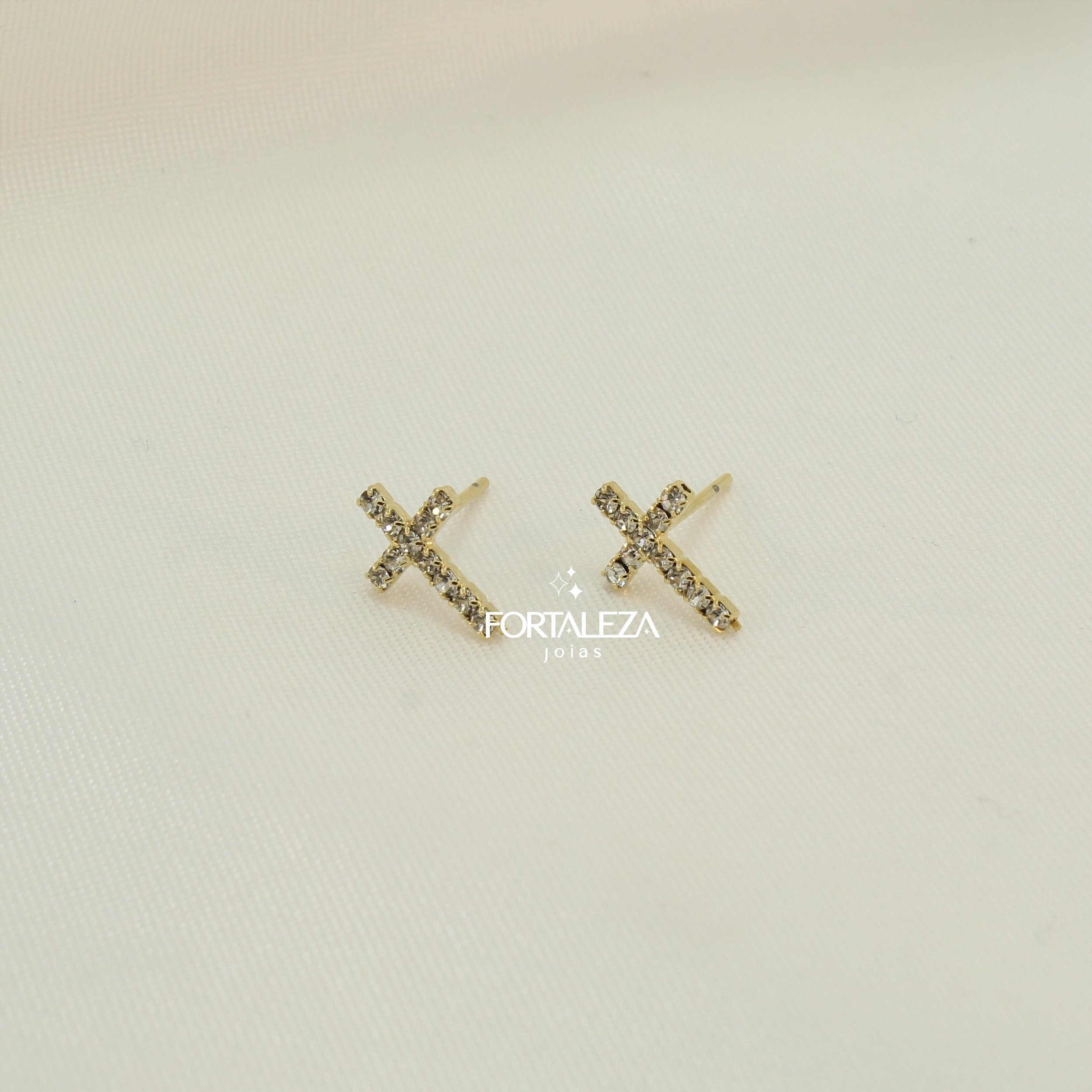 Brinco Cruz Cravejada em Zircônia Cristal Banhado a Ouro 18k