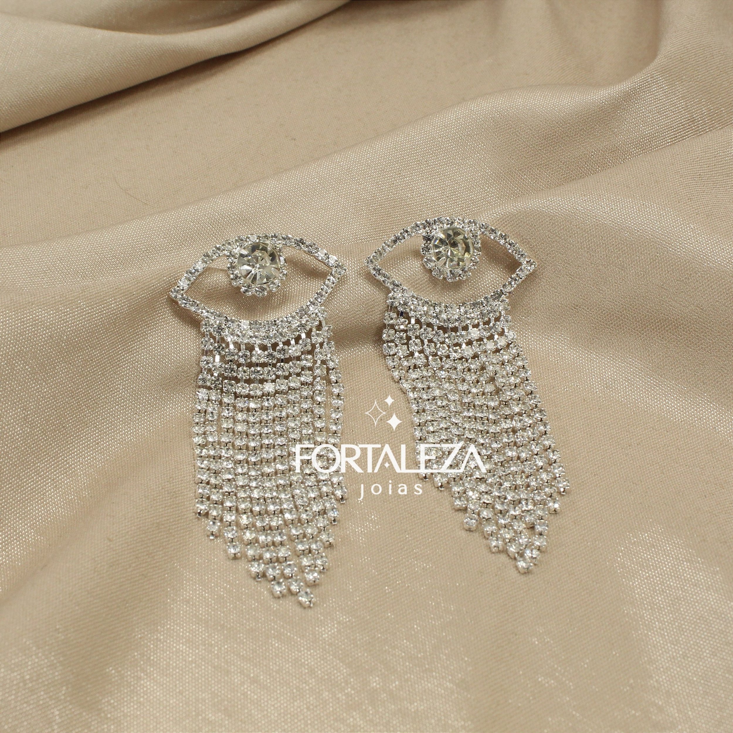 Brinco Olho com Franja Cravejado em Zircônia Cristal Banhado a Prata