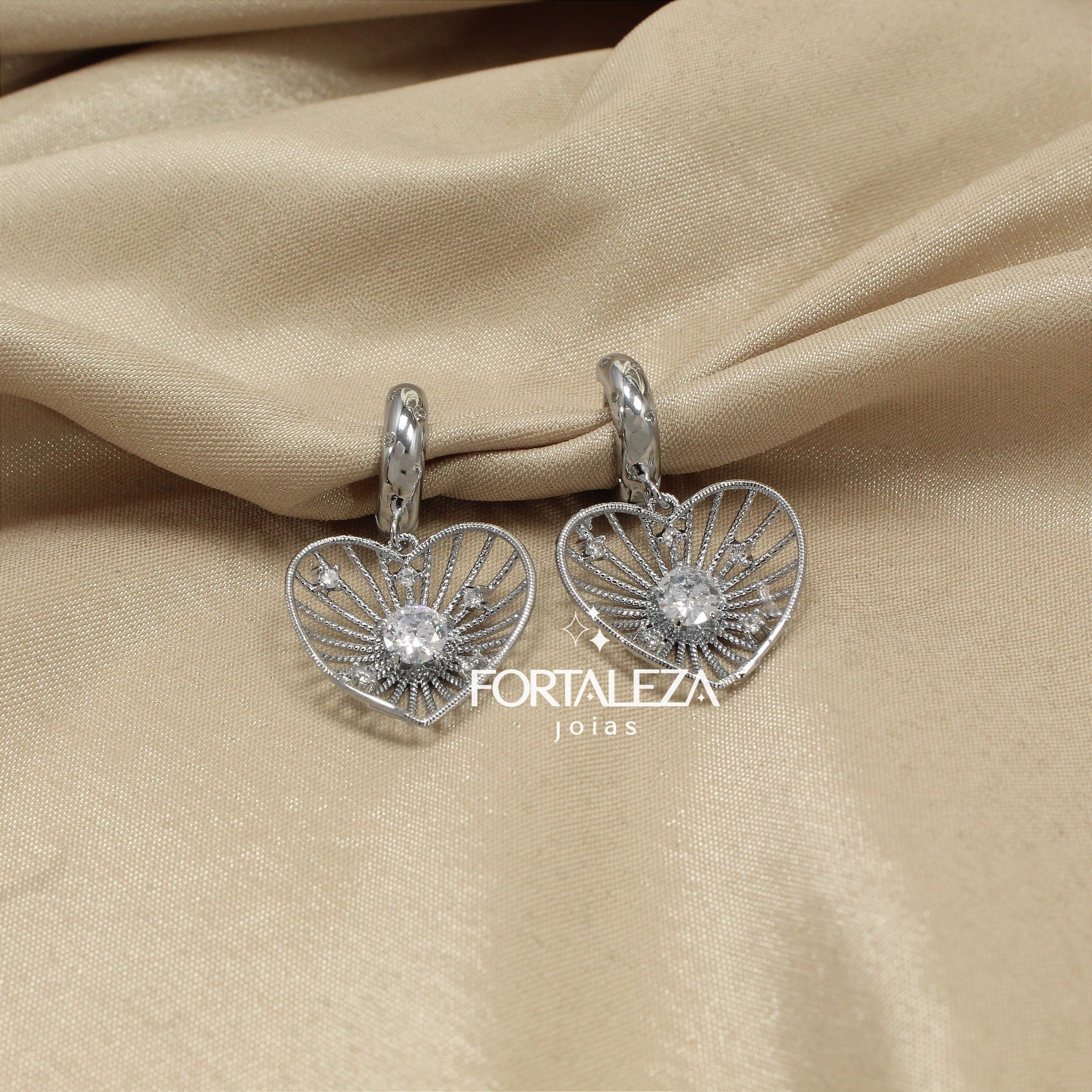 Brinco Argola de Coração com Detalhes em Zircônia Cristal Banhado a Ouro Branco