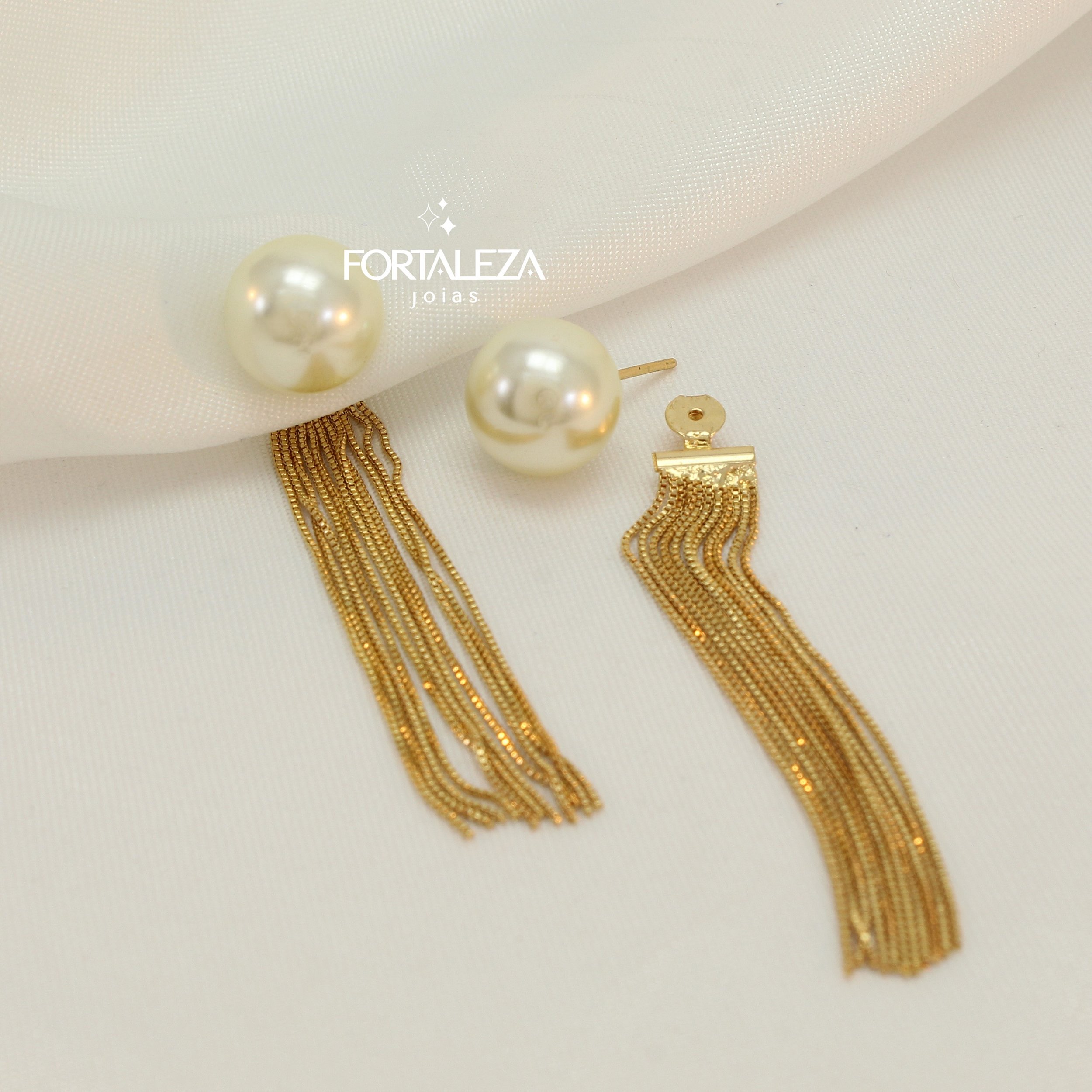 Brinco Ear Jacket de Pérola e Franja Banhado a Ouro 18k