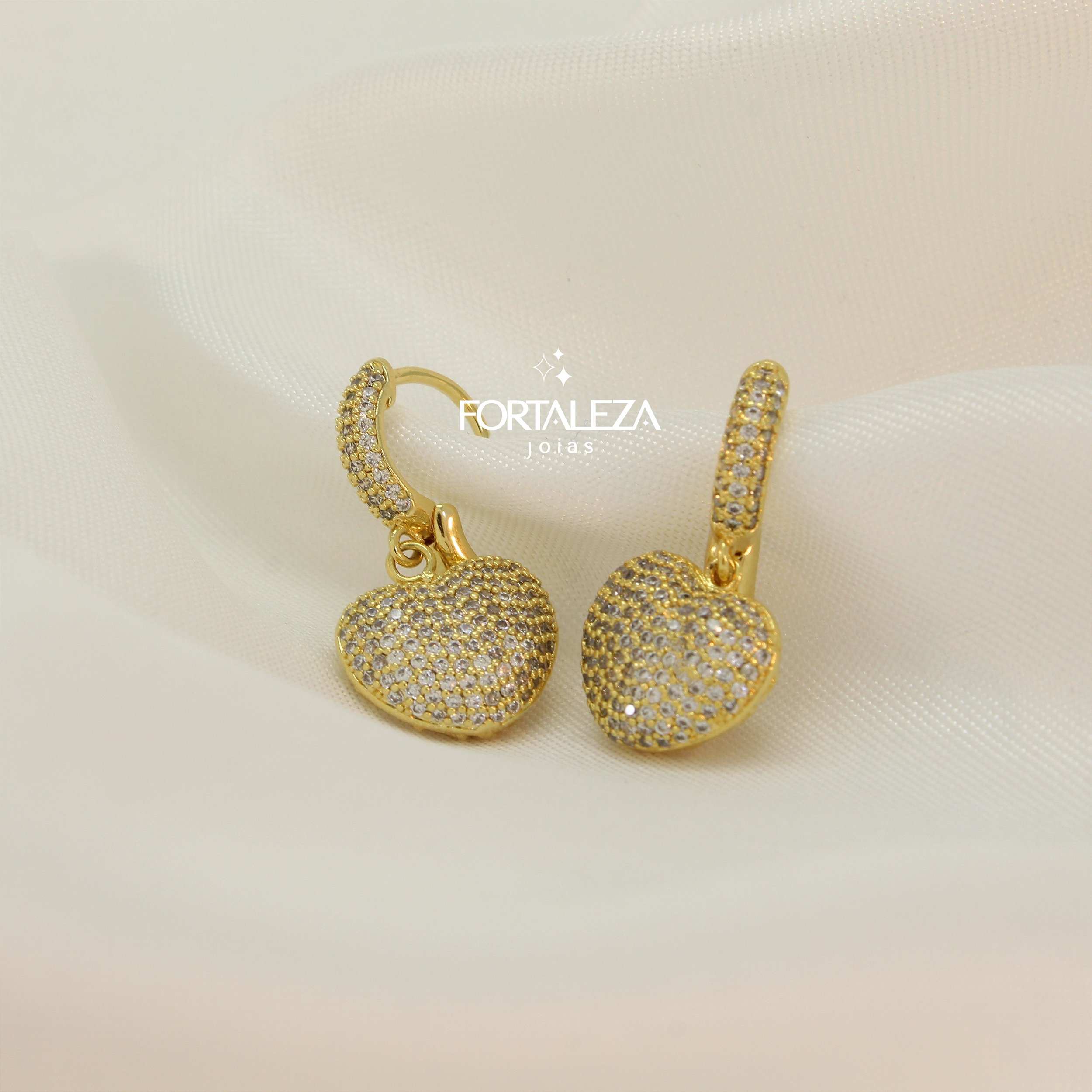Brinco Argola de Coração Cravejado em Zircônia Cristal Banhado a Ouro 18k