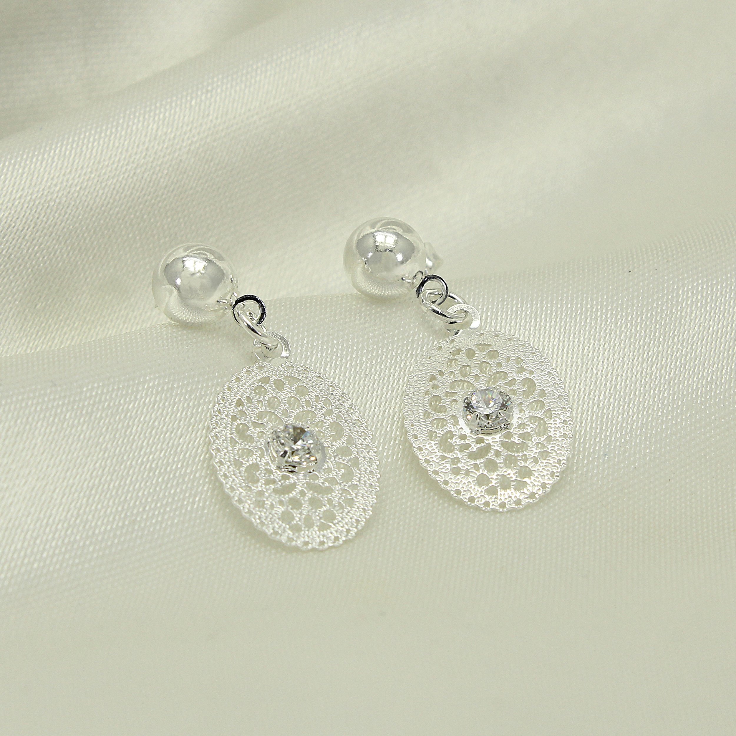 Brinco com Design Rendado e Detalhe em Zircônia Cristal Banhado com 30 Milésimos de Teor de Prata 925 e Finalizado com Verniz de Nanotecnologia