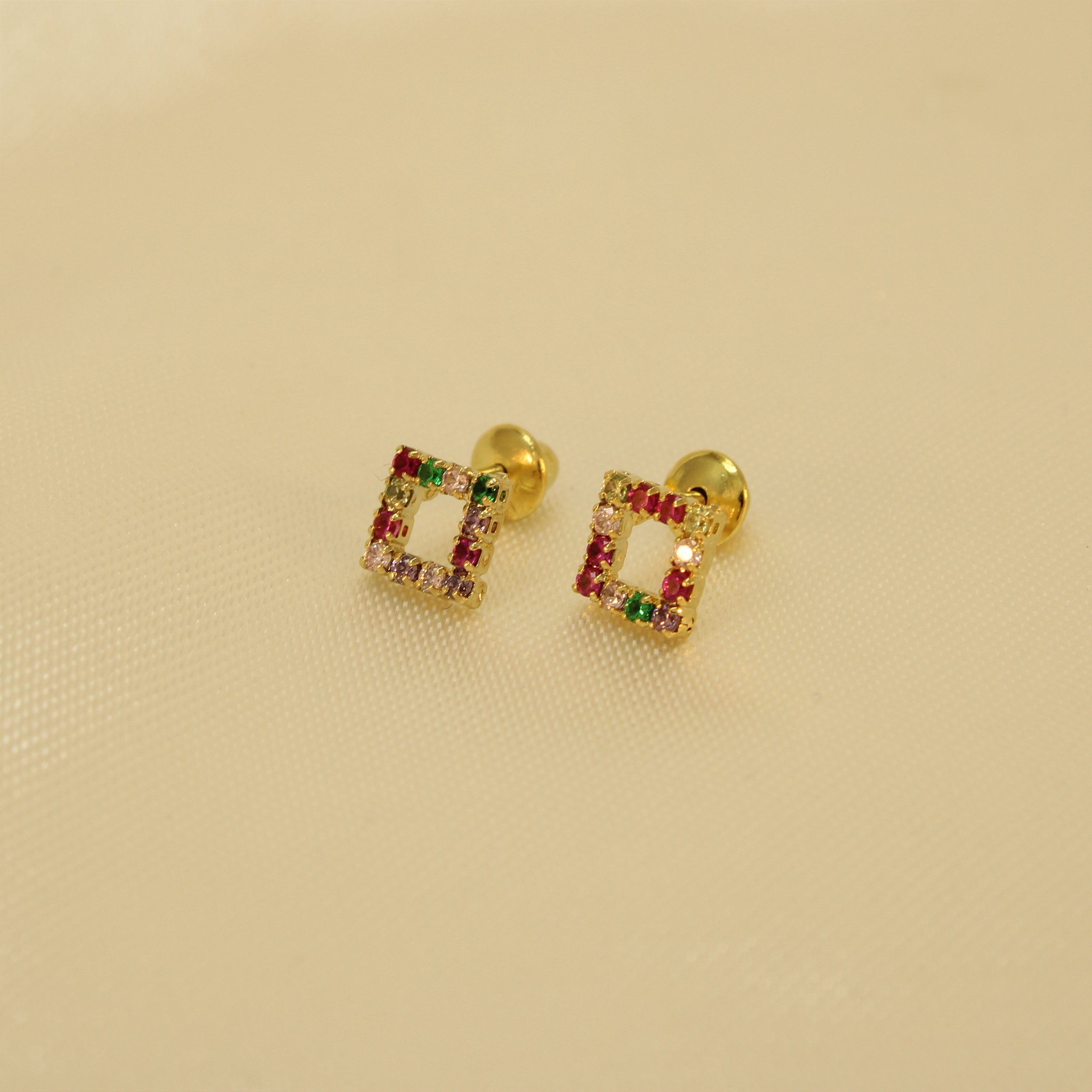 Brinco Quadrado Cravejado em Zircônias Multicoloridas Banhado a Ouro 18k
