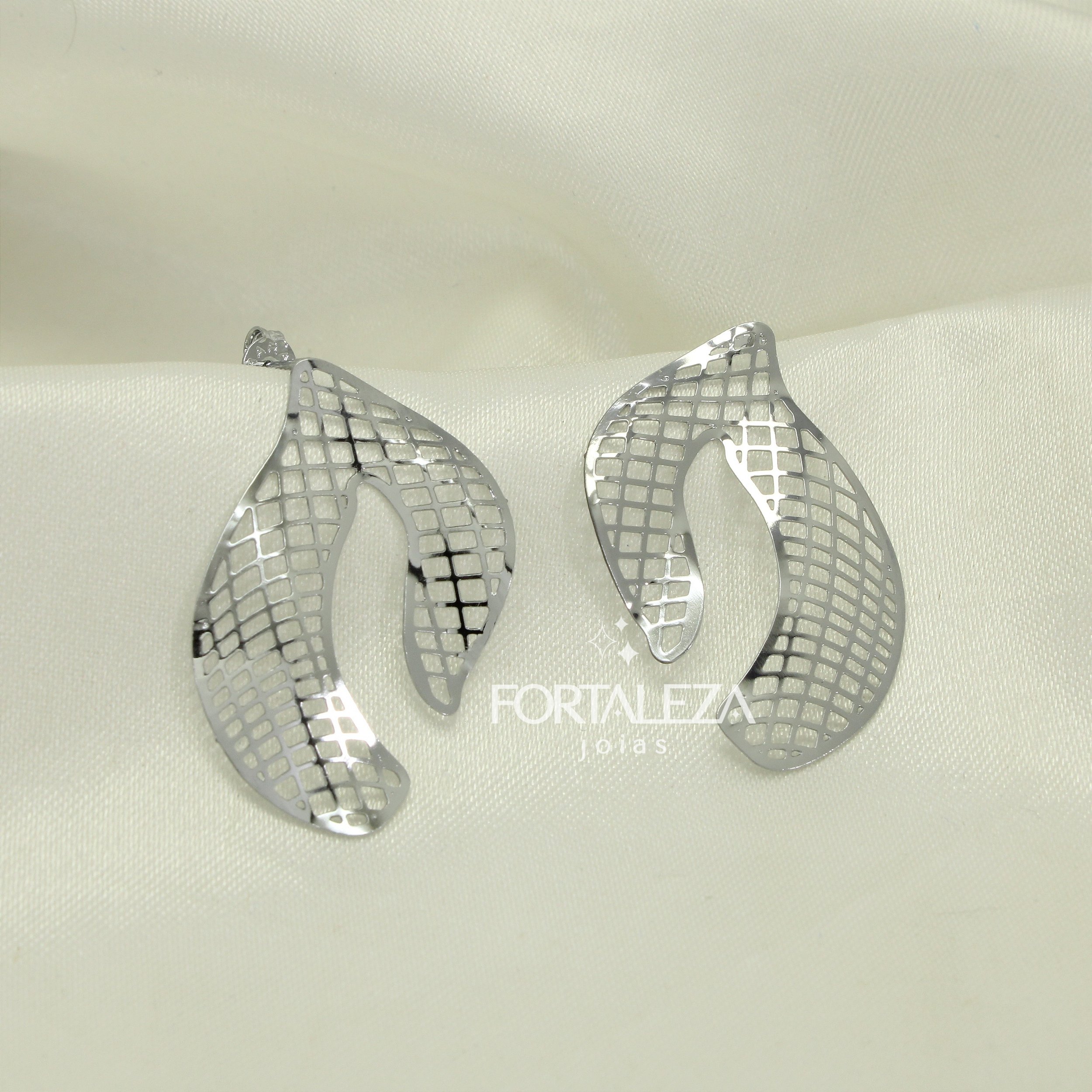 Brinco Orgânico Vazado com Trama Banhado a Ouro branco