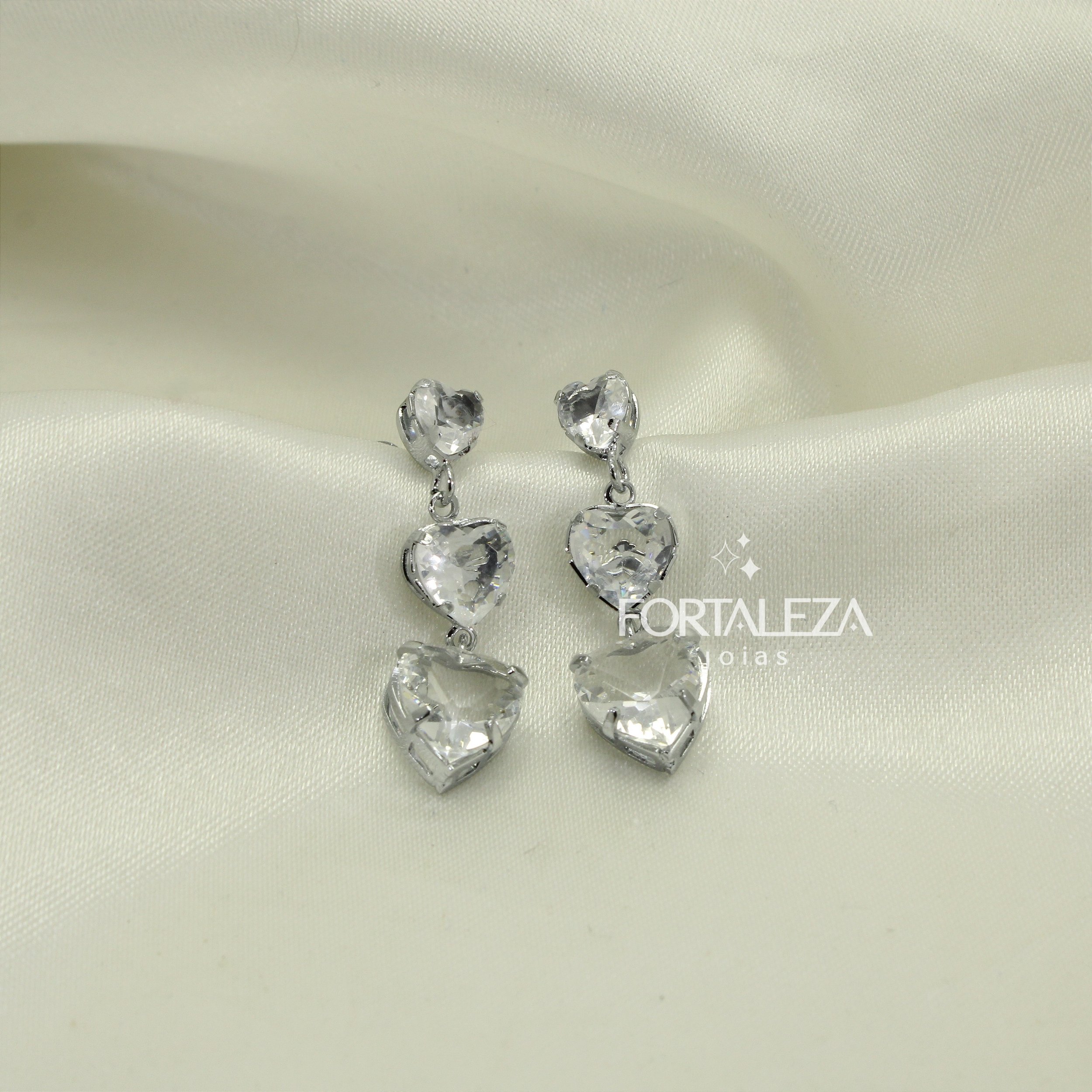Brinco de Corações em Zircônia Cristal Banhado a Ouro Branco