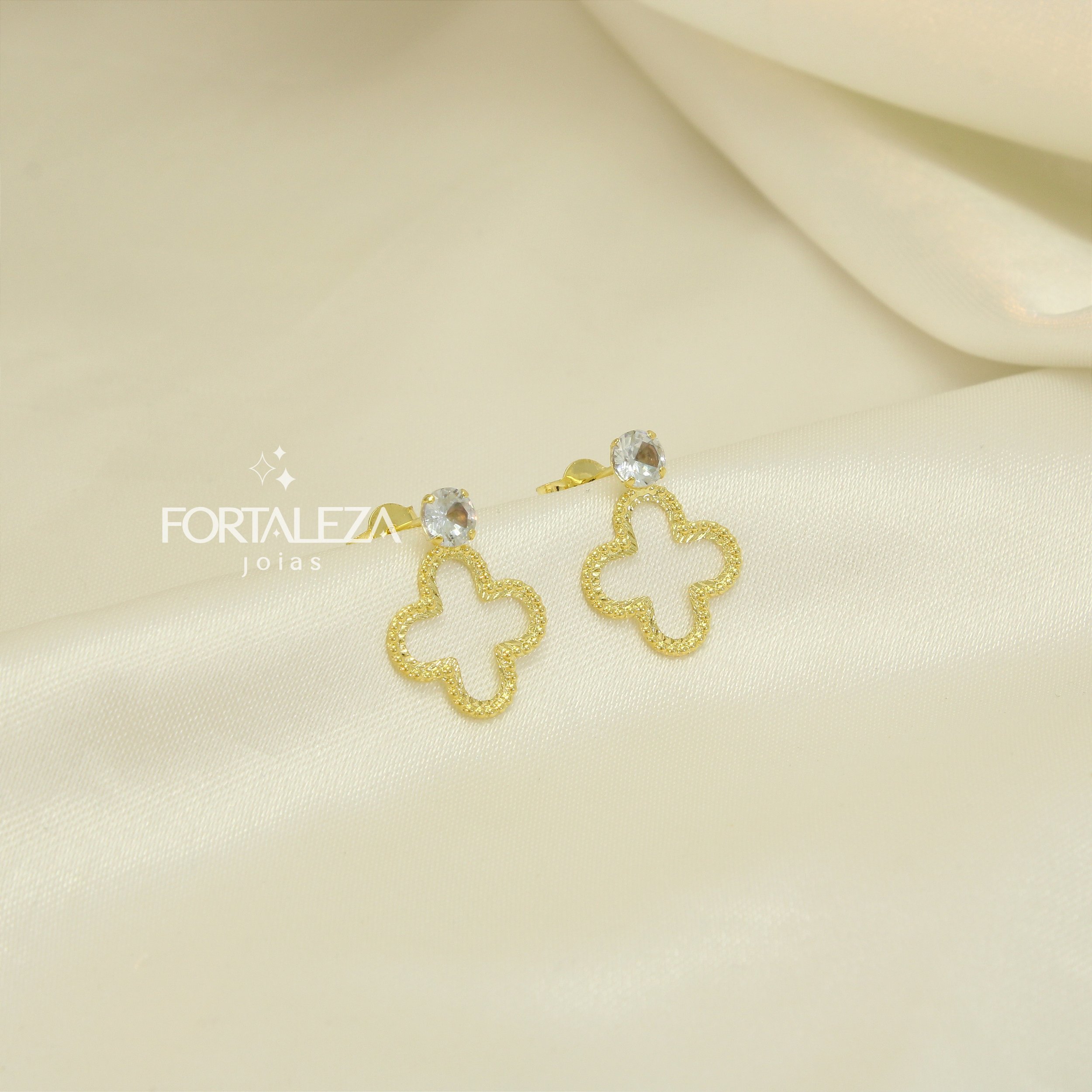 Brinco de Trevo Vazado com Zircônia Cristal Banhado a Ouro 18k