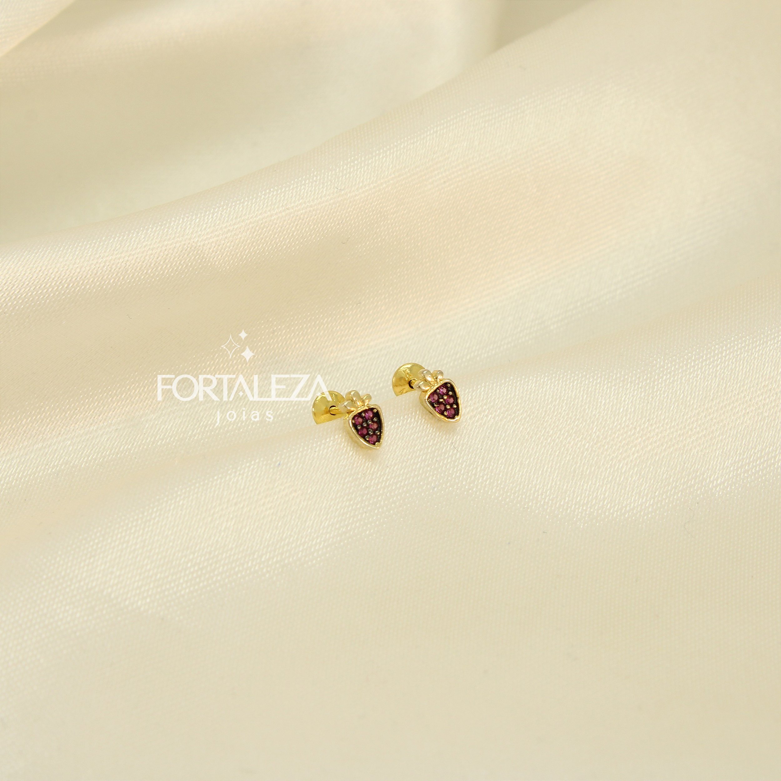Brinco Morango com Zircônia Rubi Banhado a Ouro 18k e Ródio Negro