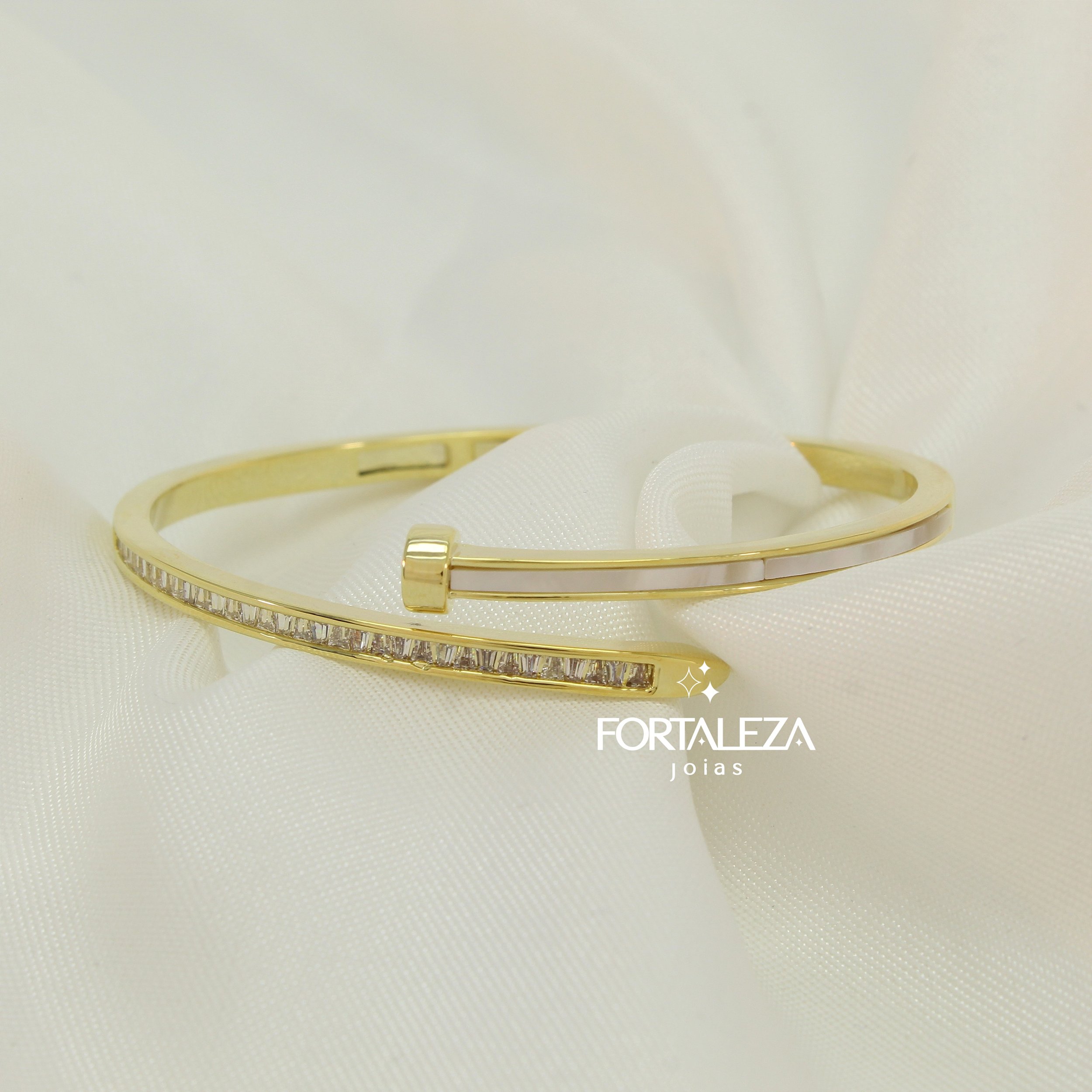 Bracelerte com Design de Prego Cravejado em Zircônia Cristal e Resina Banhado a Ouro 18k