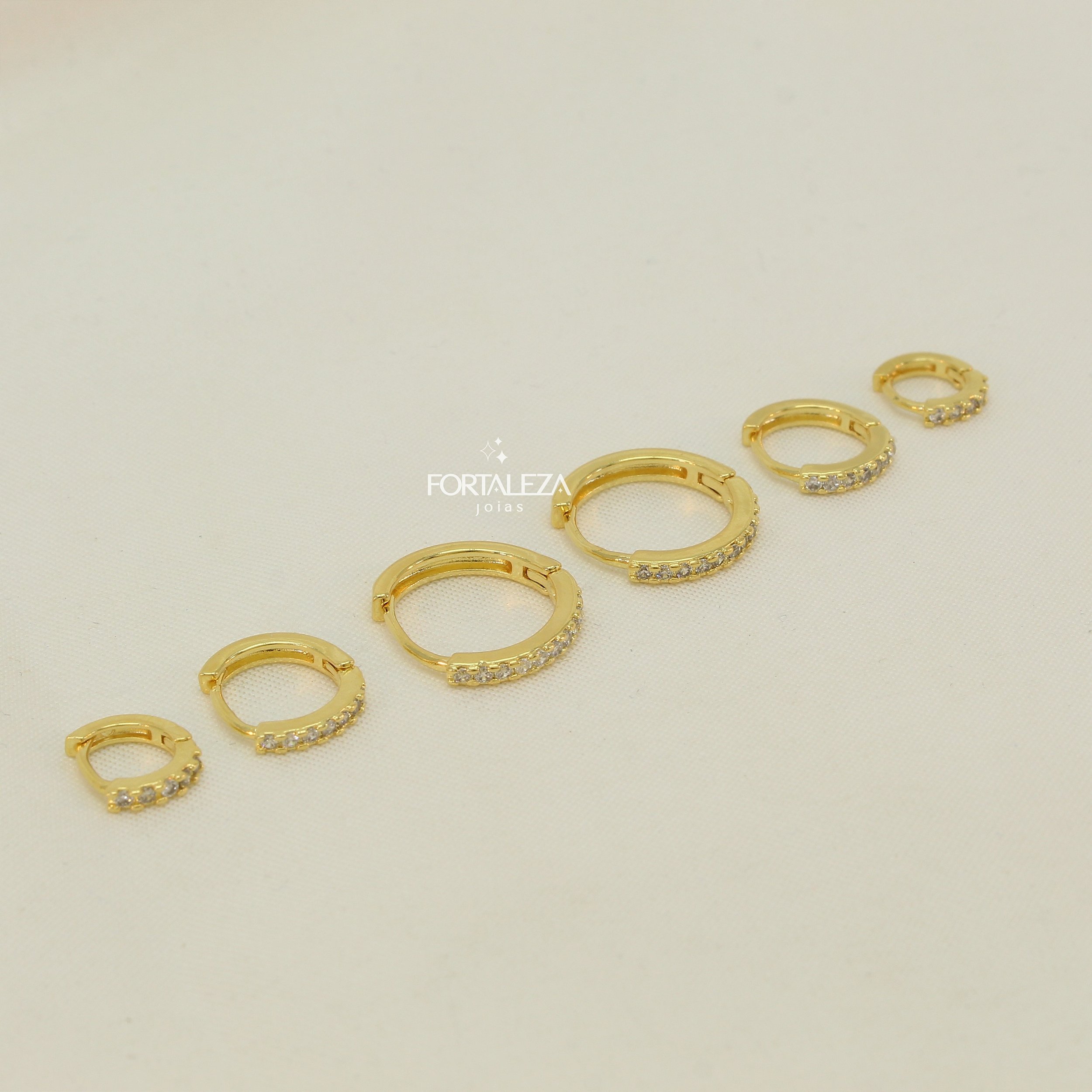 Brinco Argola em Trio Cravejada em Zircônia Cristal Banhado a Ouro 18k