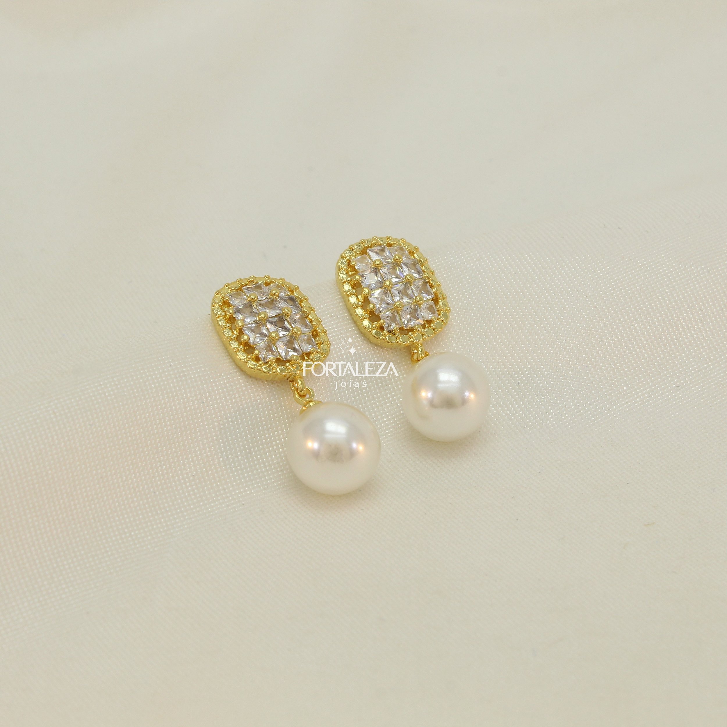 Brinco com Topo Cravejado e Pingente de Pérola Banhado a Ouro 18k