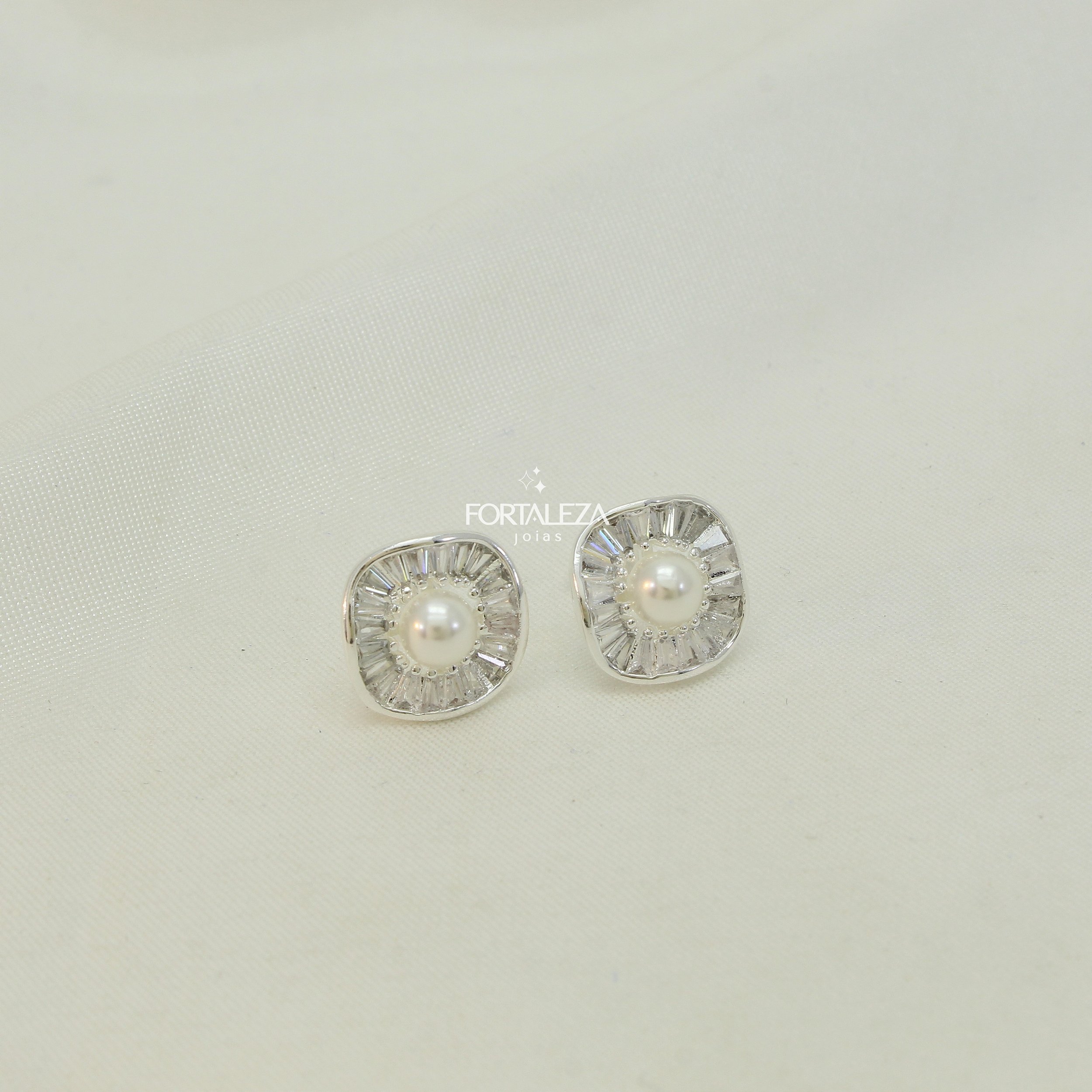 Brinco Cravejado com Zircônia Cristal e Detalhe de Pérola Banhado a Prata
