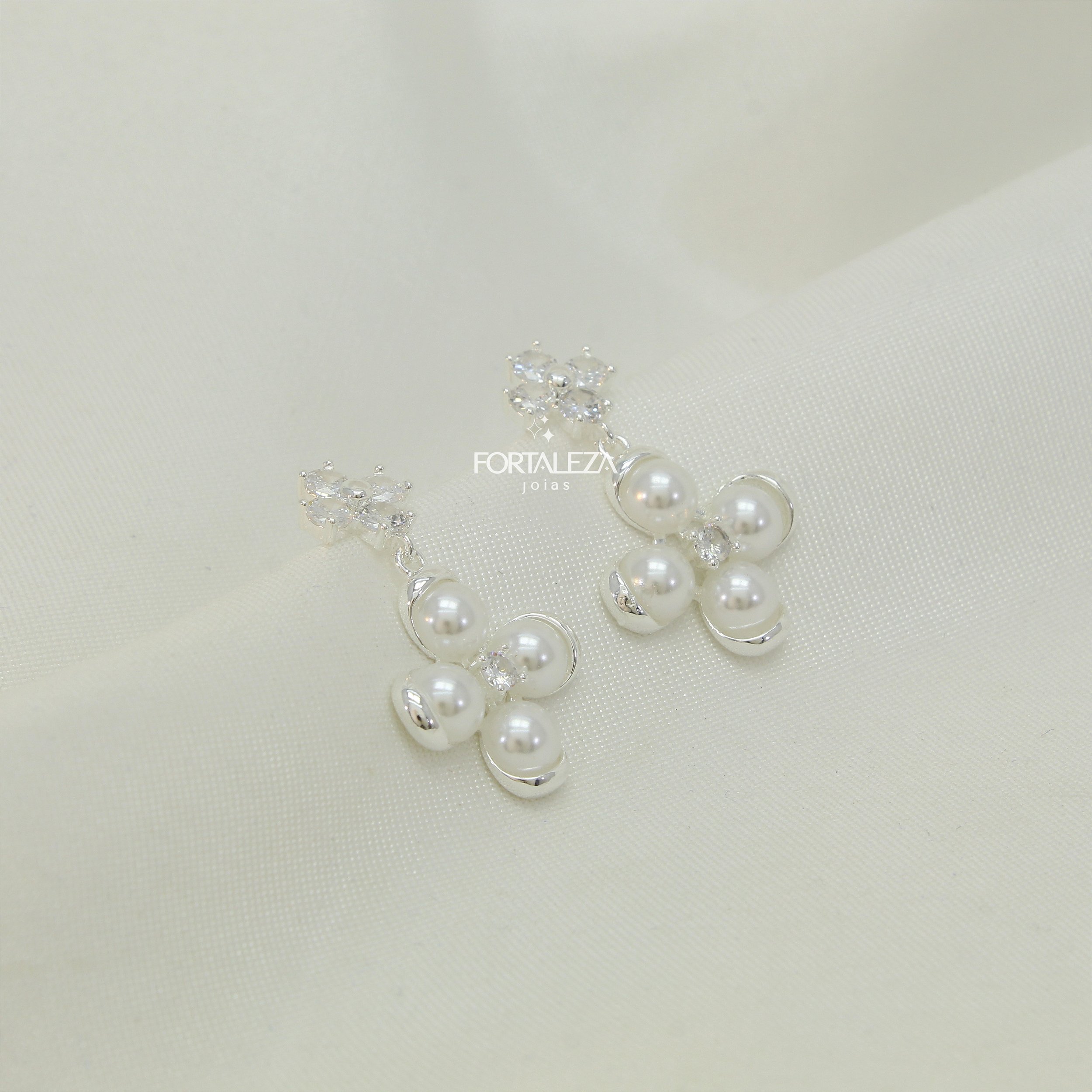 Brinco de Flor com Pérolas e Zircônia Cristal Banhado a Prata