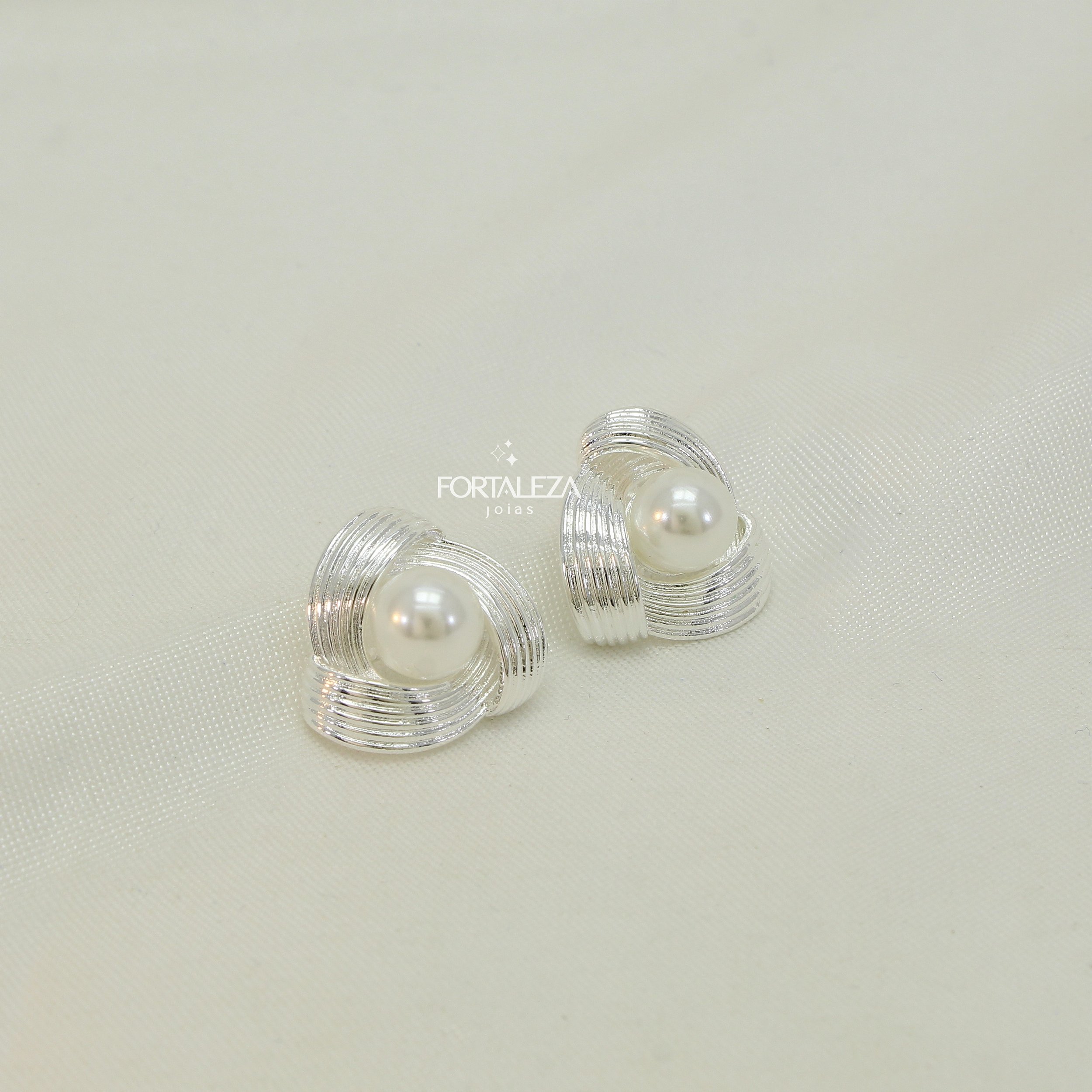 Brinco de Metal Entrelaçado com Pérola Banhado em Prata