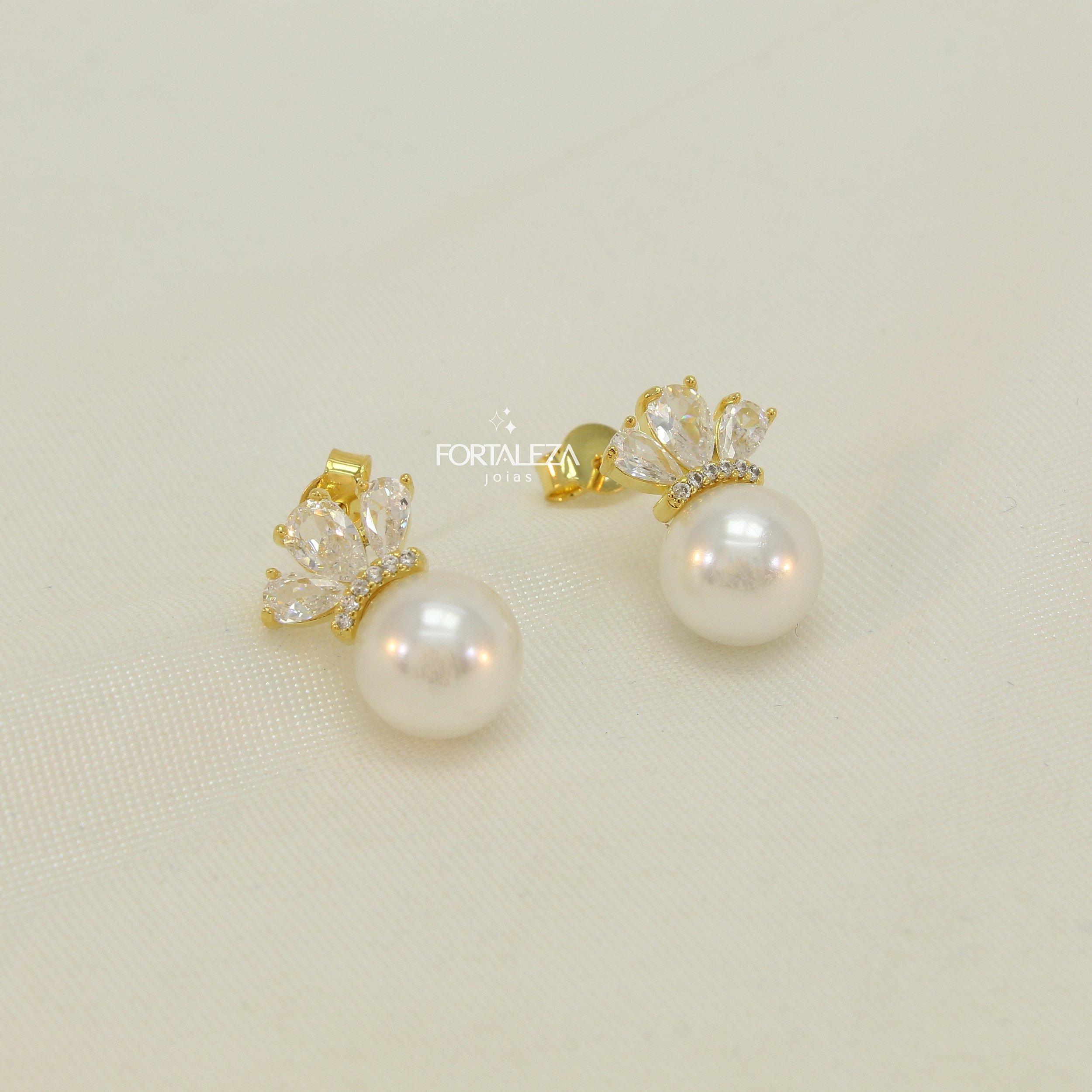 Brinco de Pérola com Detalhes Cravejados em Zircônia Cristal Banhado a Ouro 18k