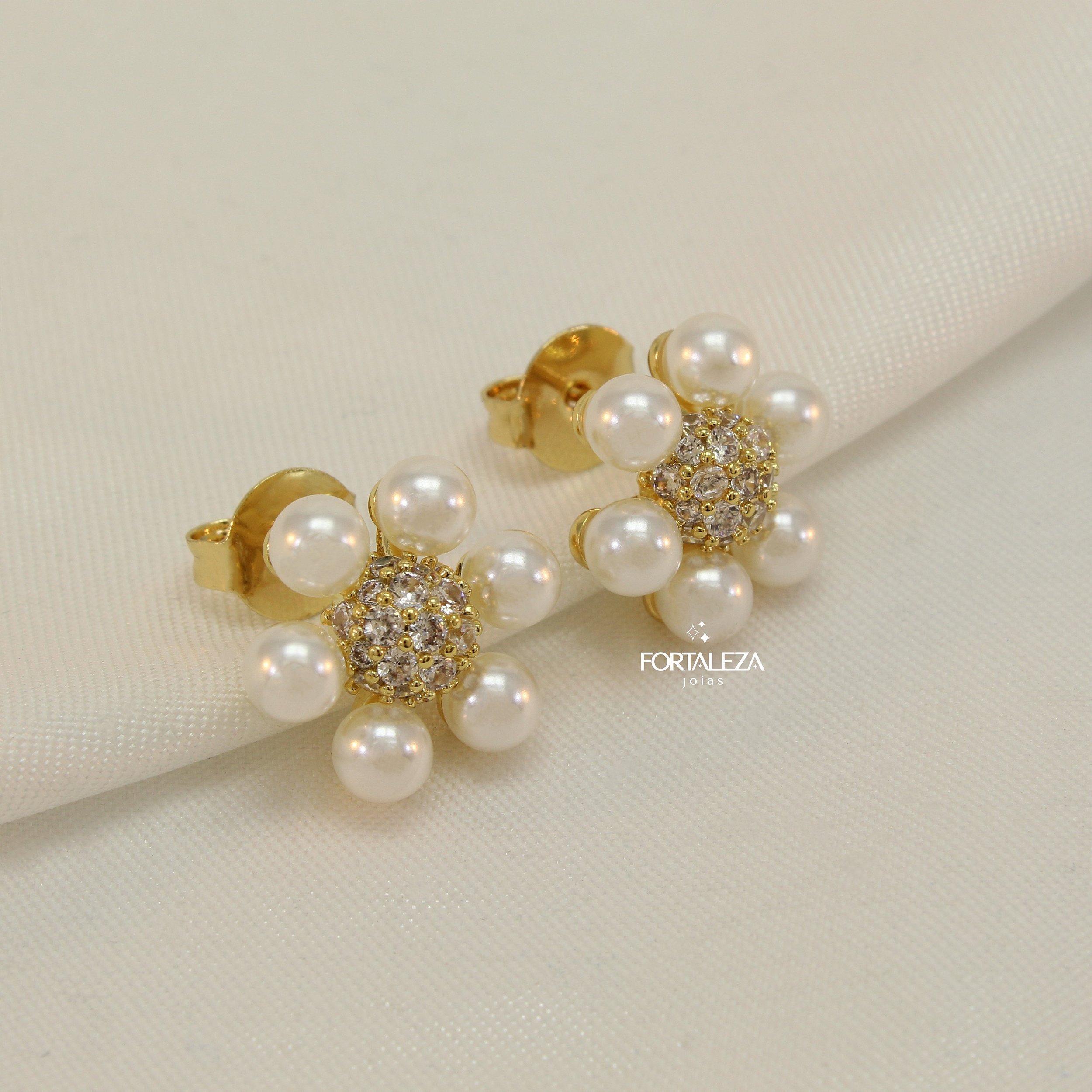 Brinco de Pérolas Cravejado em Zircônia Cristal Banhado a Ouro 18k