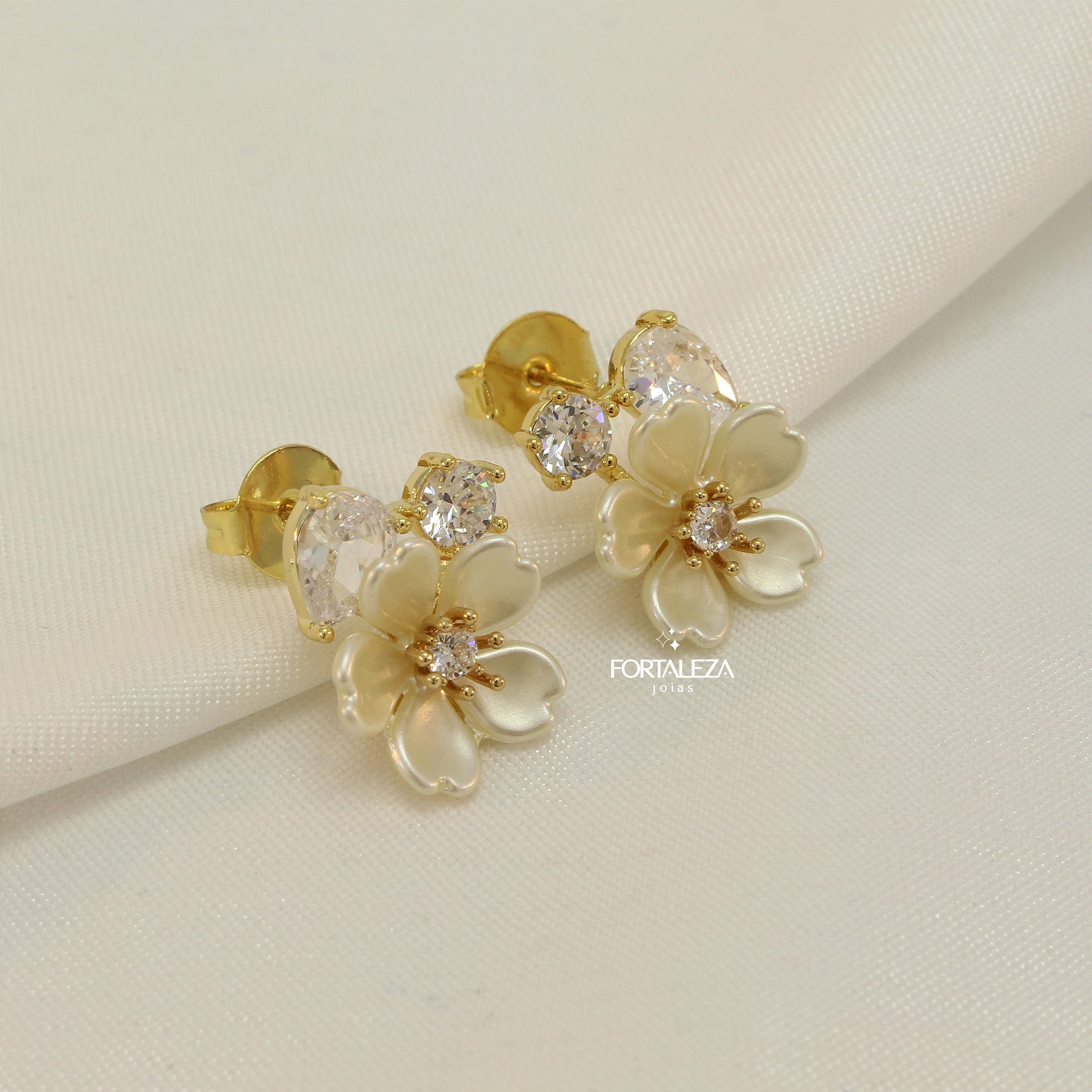 Brinco de Pétala Perolada com Zircônias Cristais Banhado a Ouro 18k