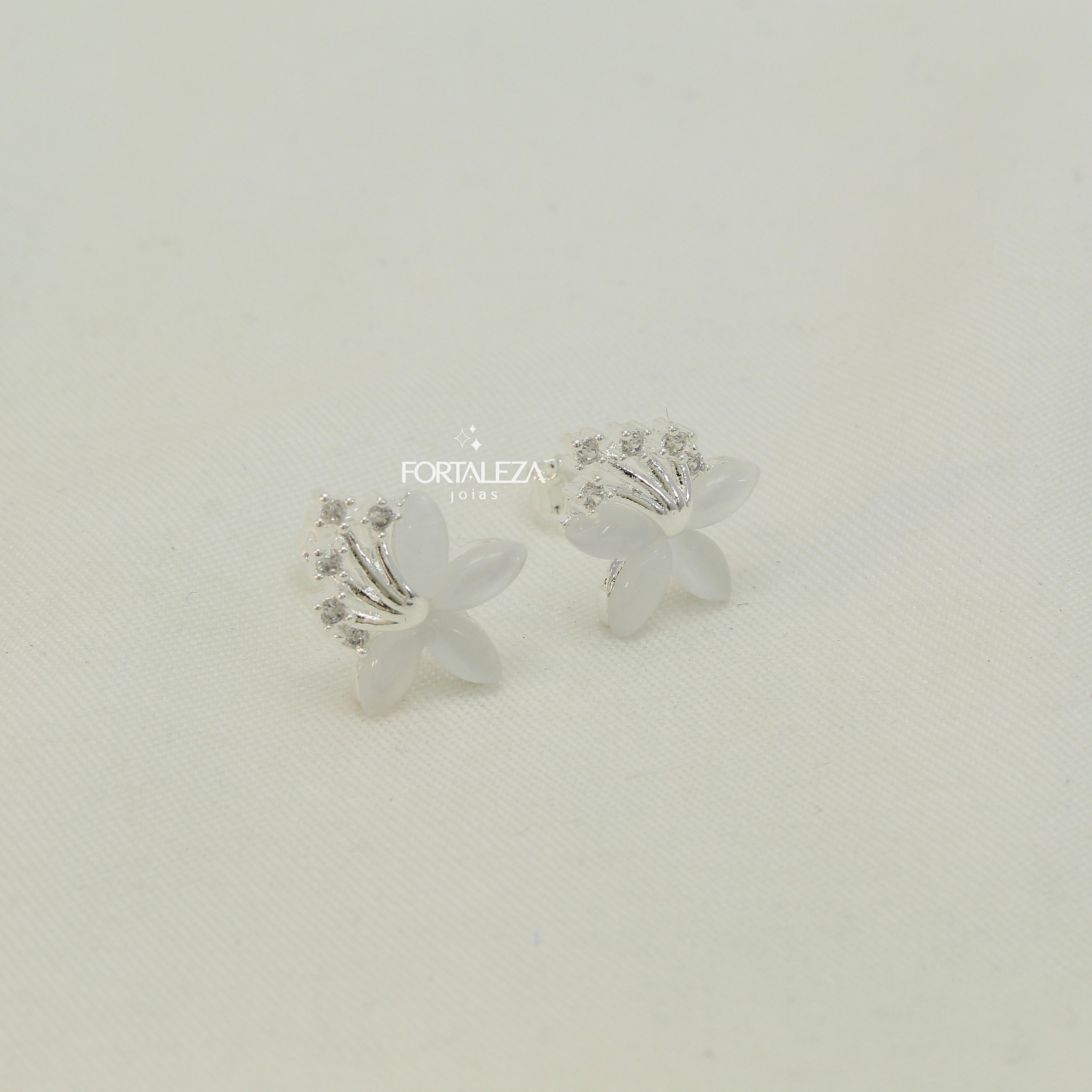 Brinco Delicado de Flor com Pétalas Madrepérolas e Zircônia Cristal Banhado a Prata