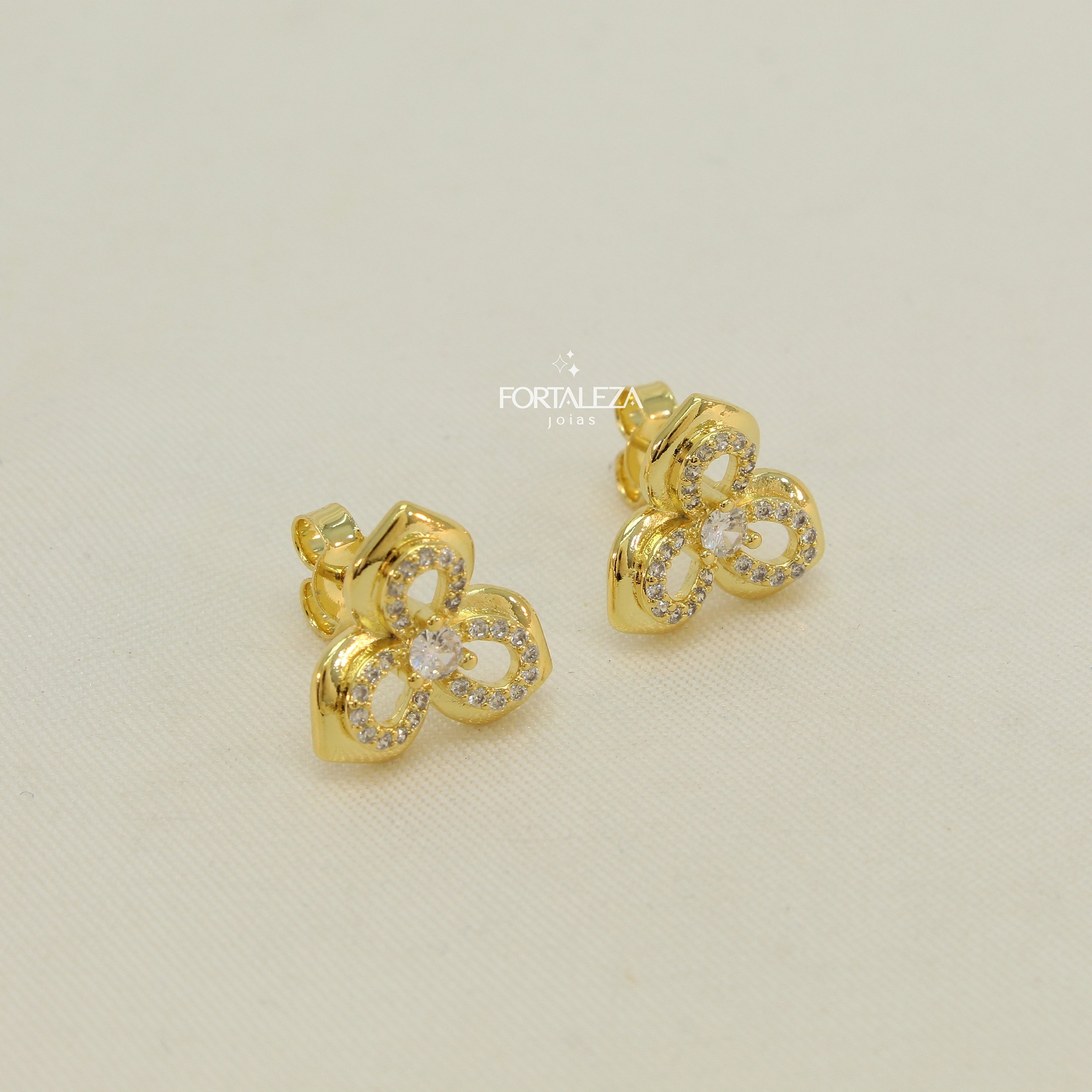 Brinco Flor Três Pétalas Cravejado com Zircônia Cristal Banhado a Ouro 18k