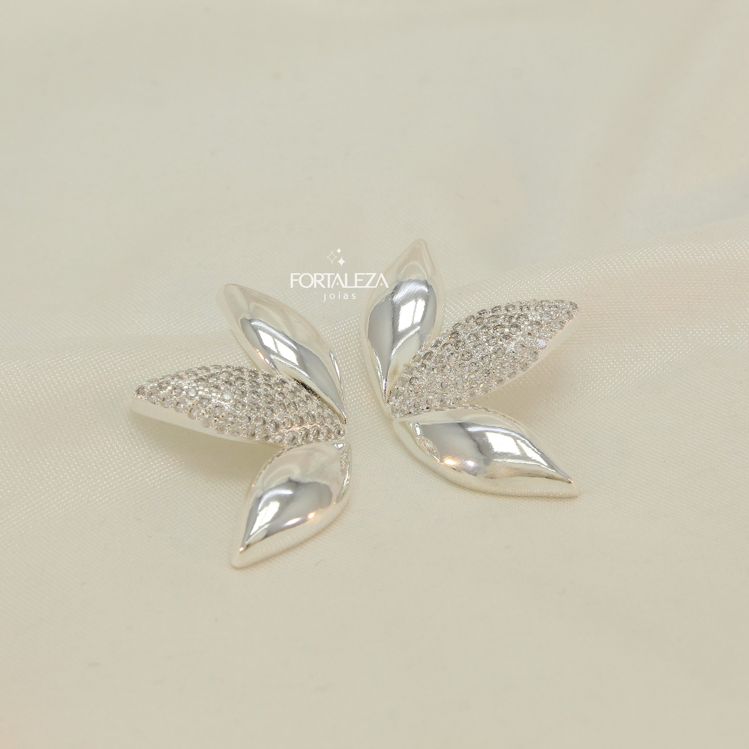 Brinco Meia Flor com Pétala Cravejada com Zircônia Cristal Banhado a Prata