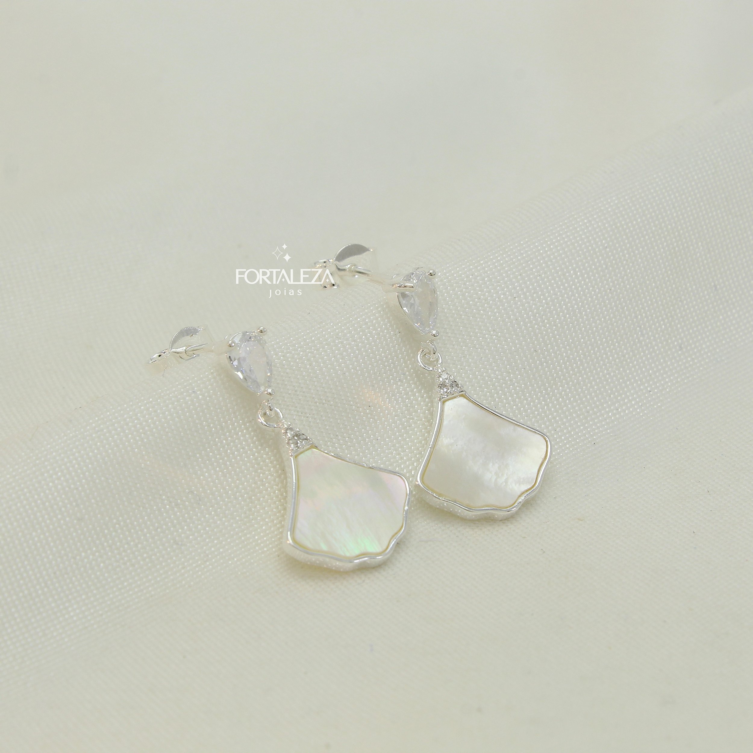 Brinco Pêndulo Leque de Madrepérola com Zircônia Cristal Banhado a Prata