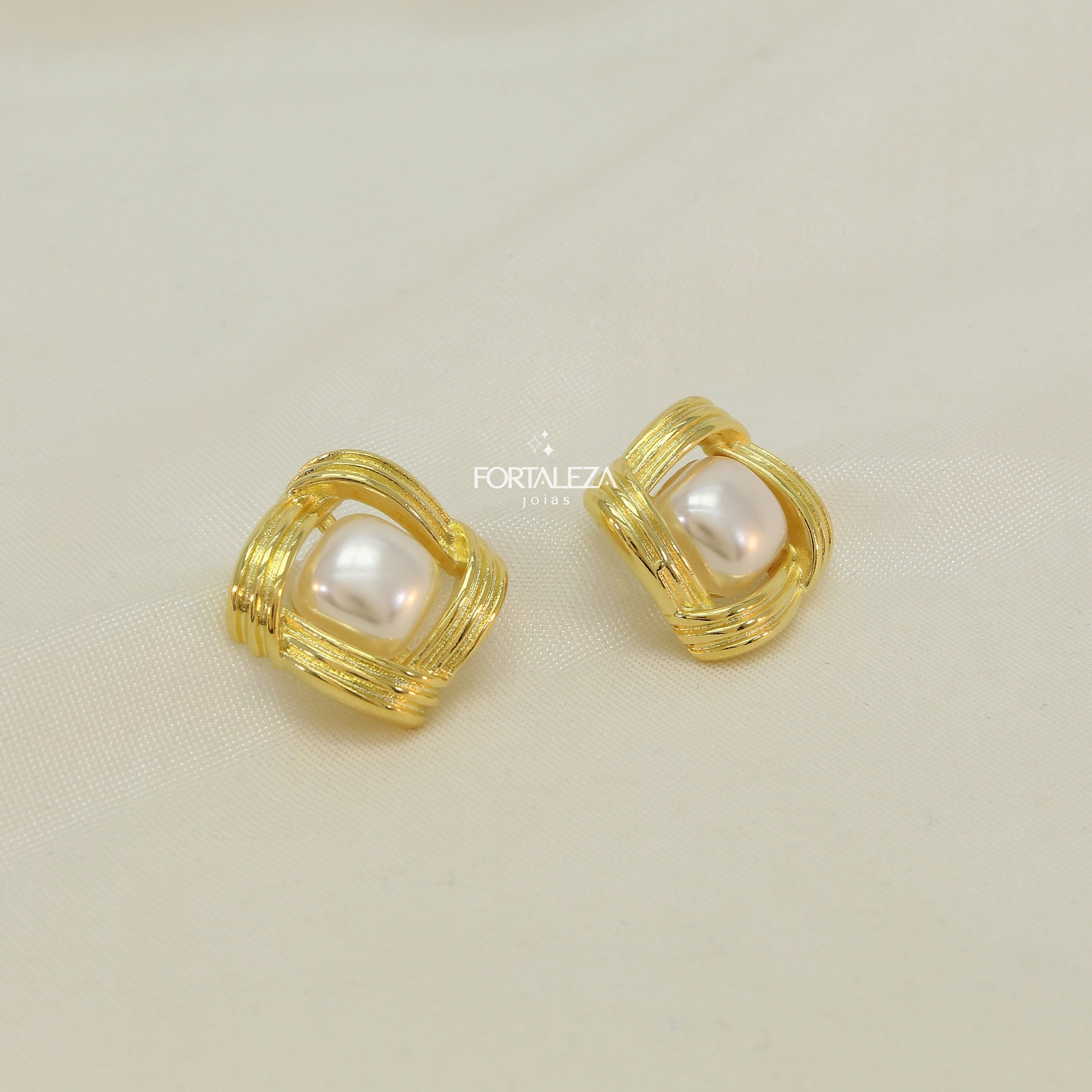 Brinco Quadrado Pérola com Borda Entrelaçada Banhado a Ouro 18k