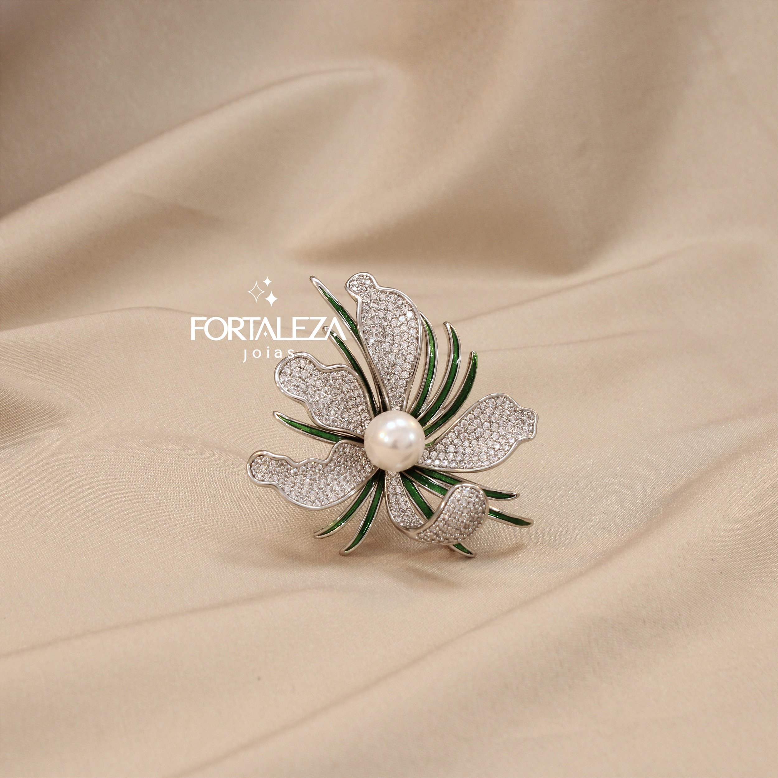 Broche de Flor Cravejada em Zircônia Cristal e Detalhe de Pérola Banhado a Ouro Branco