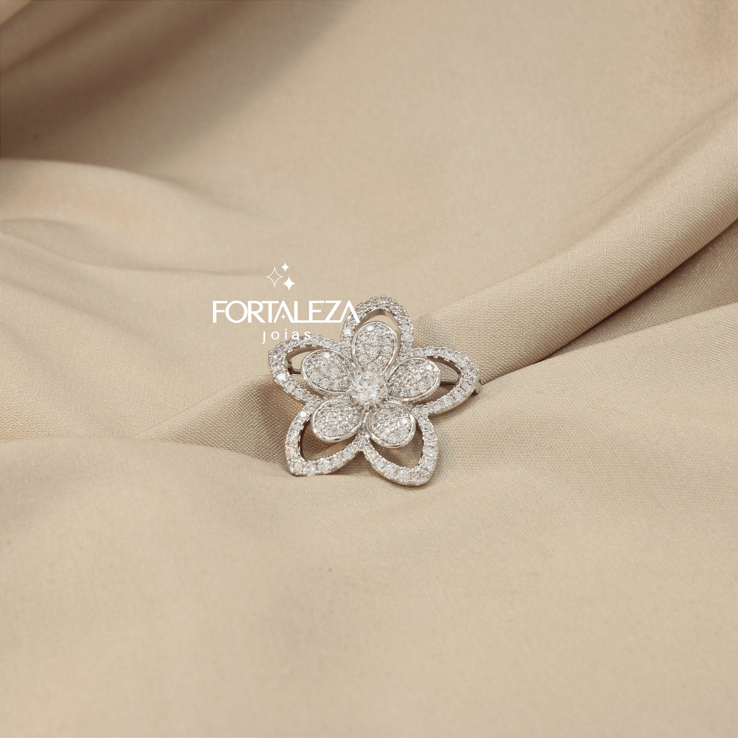 Broche Flor Cravejado em Zircônia Cristal Banhado a Ouro Branco