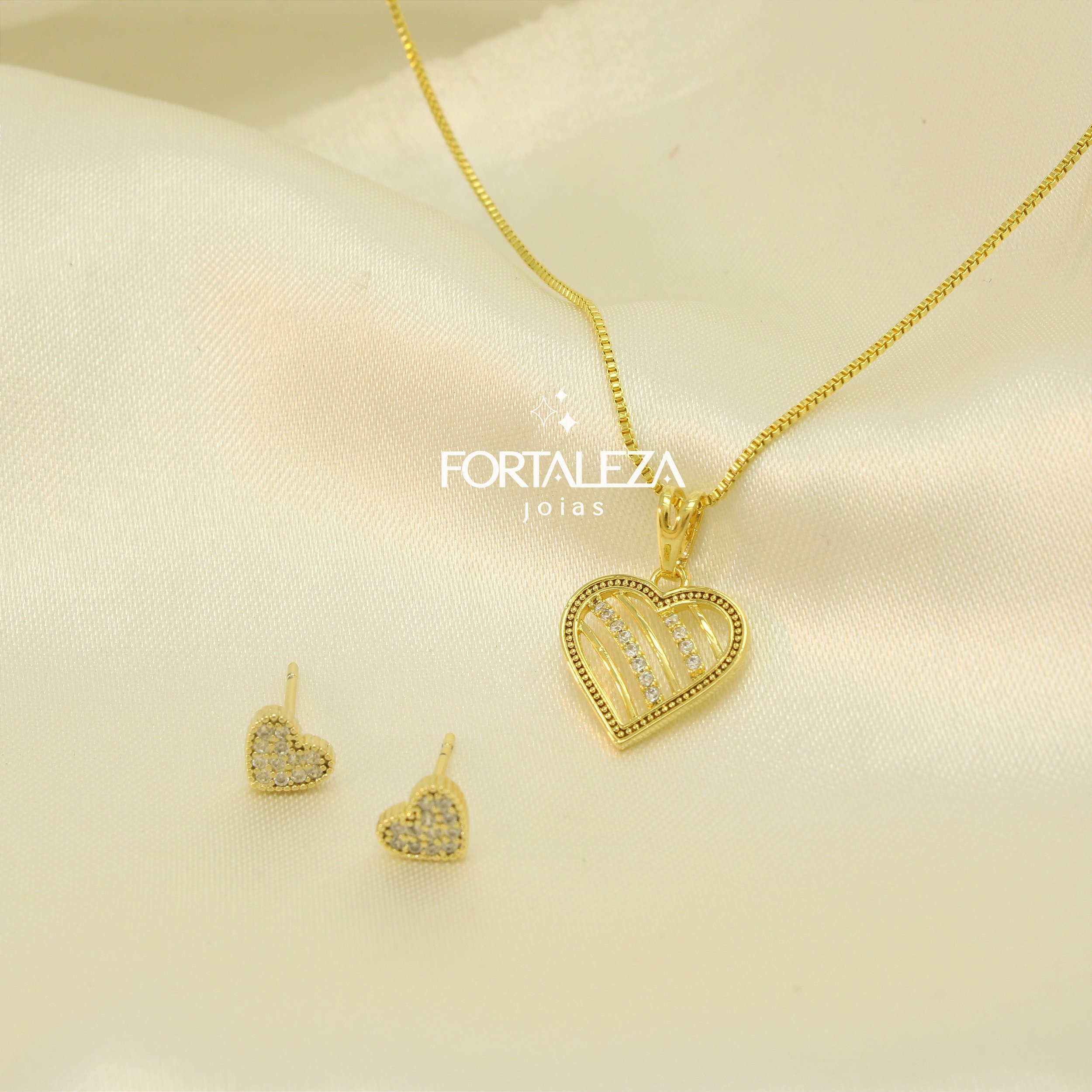 Conjunto Coração com Zircônia Cristal Cravejada Banhado a Ouro 18k