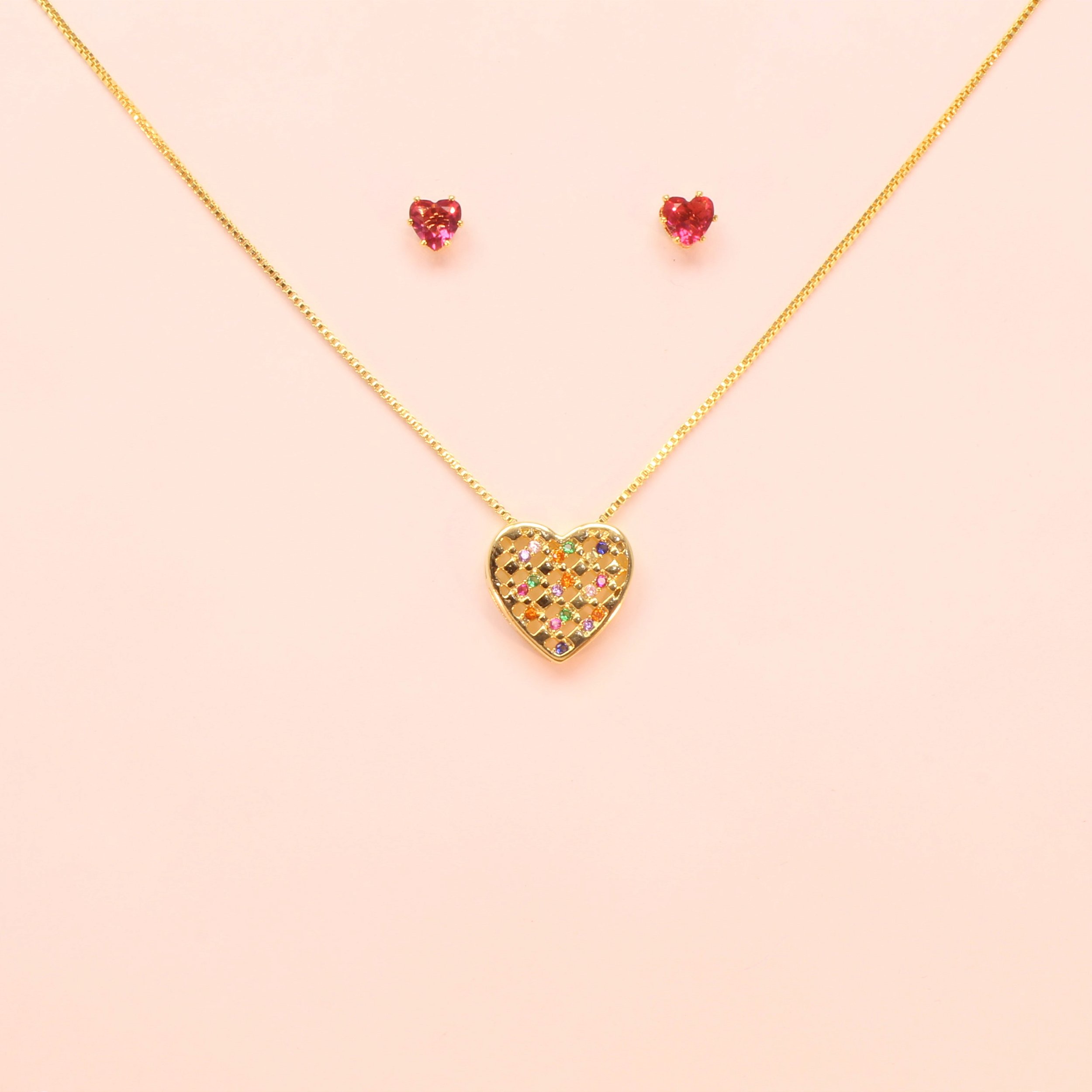 Conjunto Coração com Detalhe em Zircônia Folheado a Ouro 18k