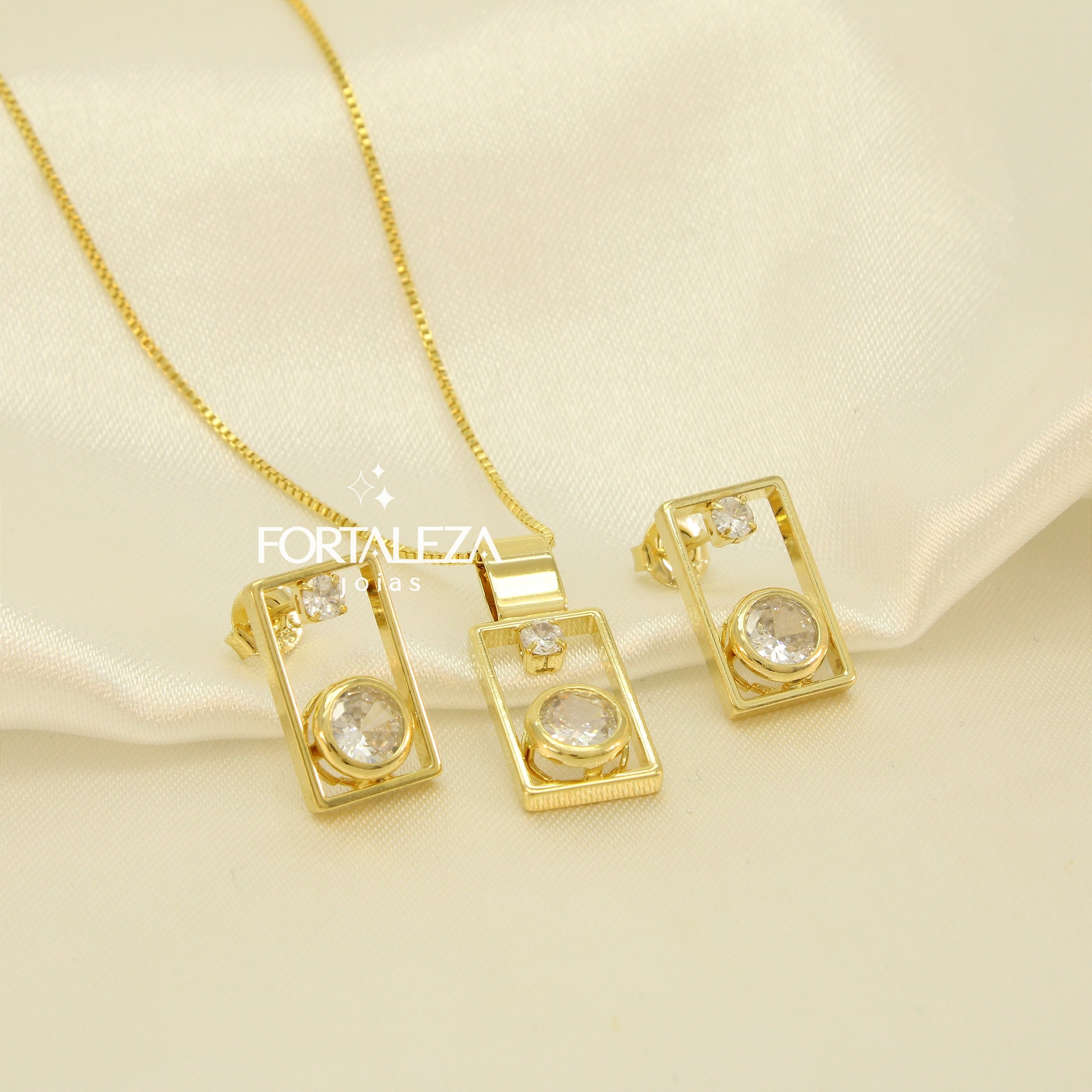 Conjunto Geométrico com Zircônia Cristal Banhado a Ouro 18k