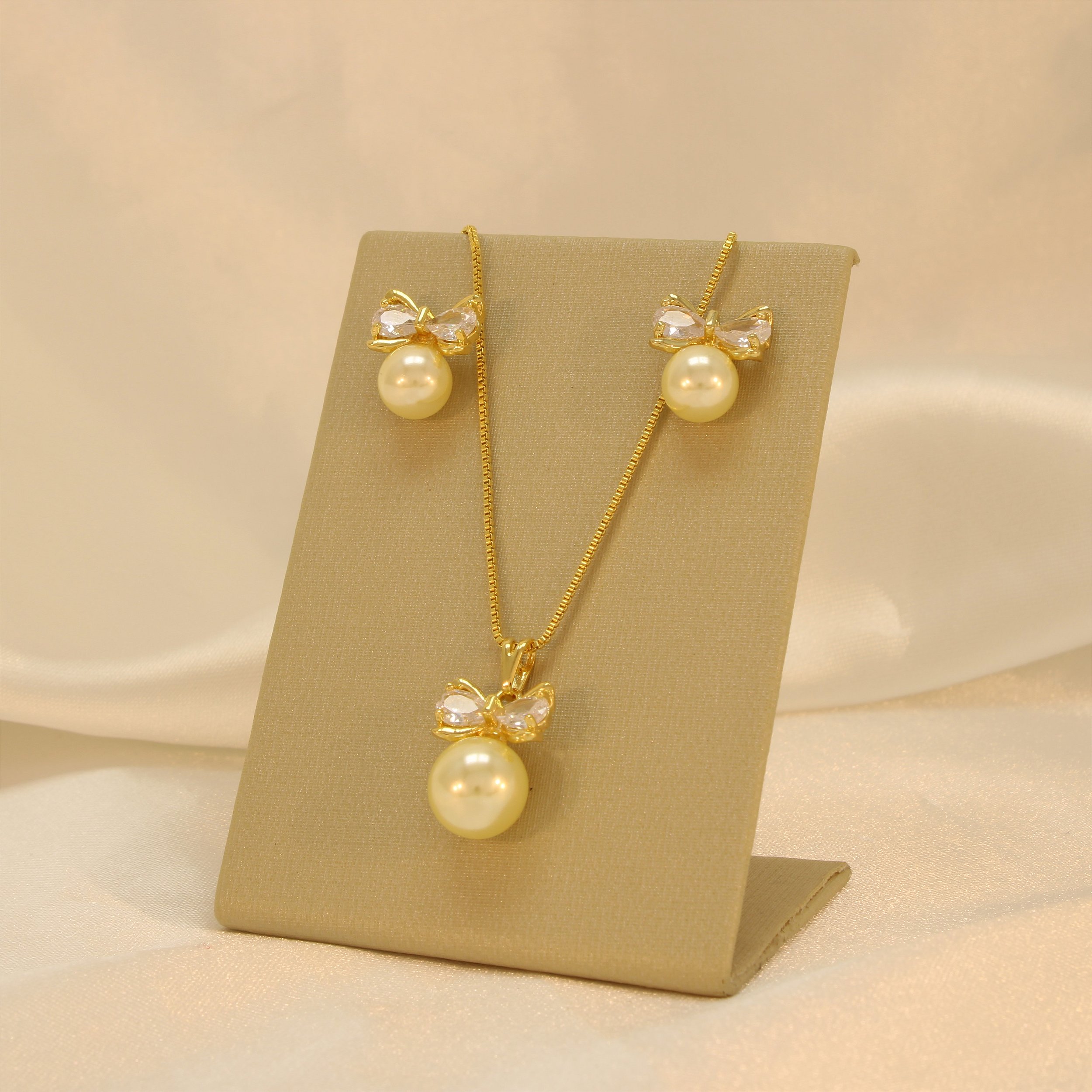 Conjunto de Laço com Pérola e Zircônia Cristal Banhado a Ouro 18k
