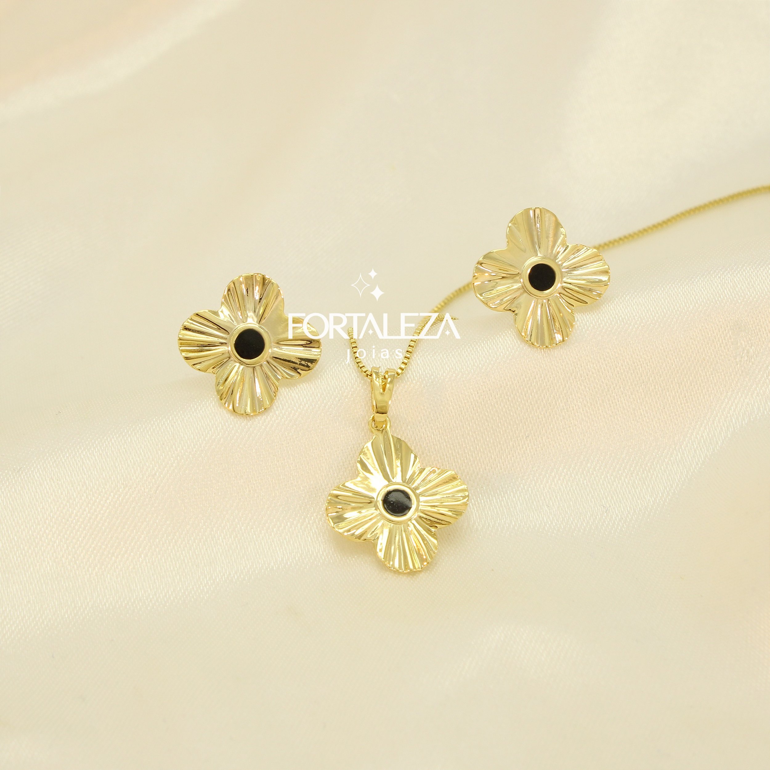 Conjunto de Flor Plissado com Detalhe em Resina Banhado a Ouro 18k