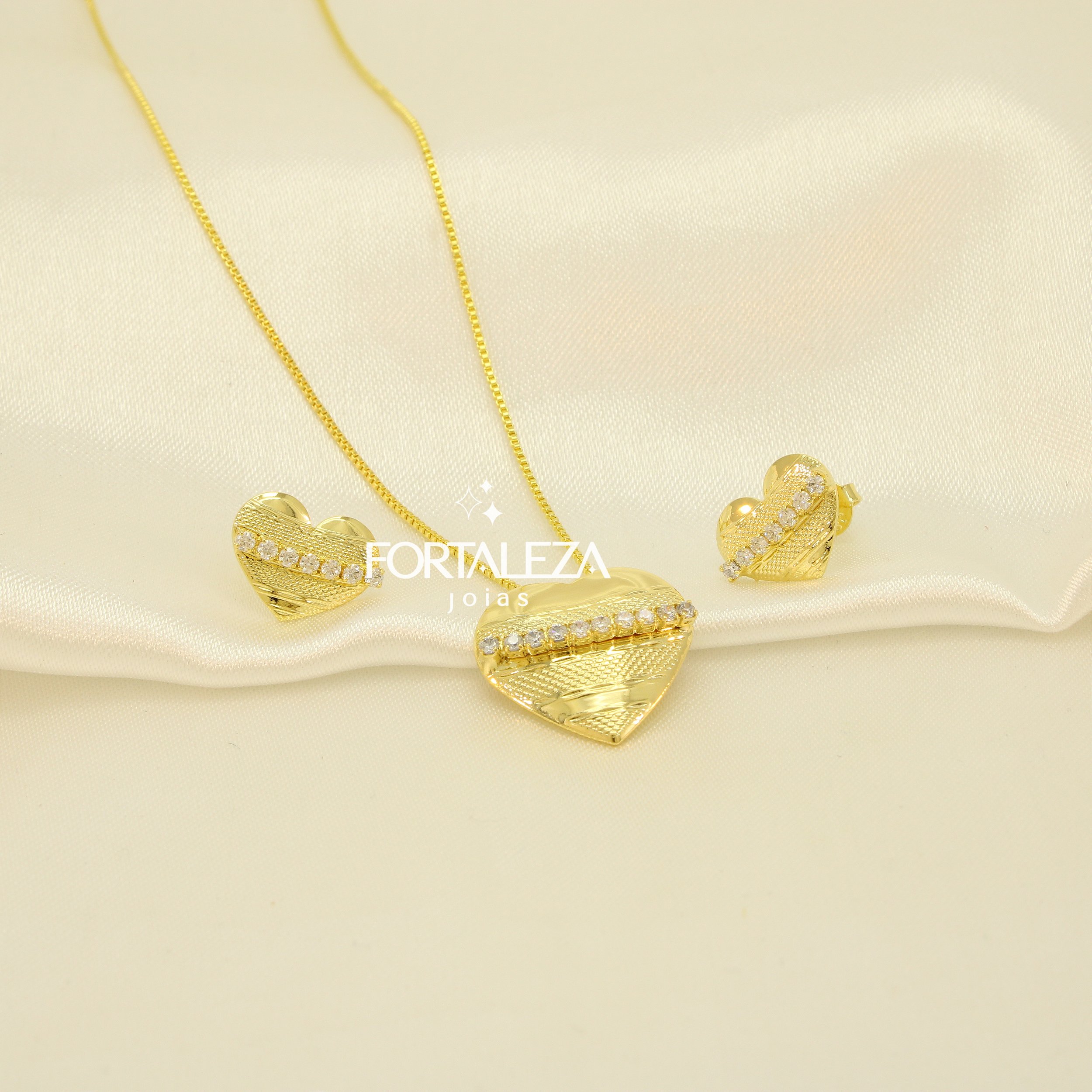 Conjunto Coração com Detalhes em Zircônia Cristal Banhado a Ouro 18k