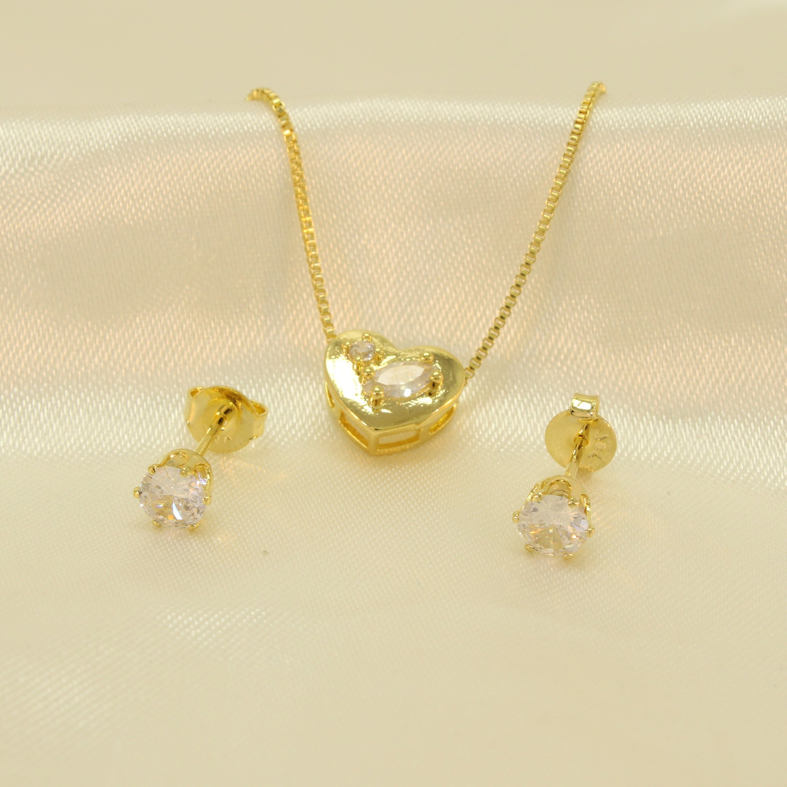 Conjunto de Coração com Zircônia Cristal Banhado a Ouro 18k
