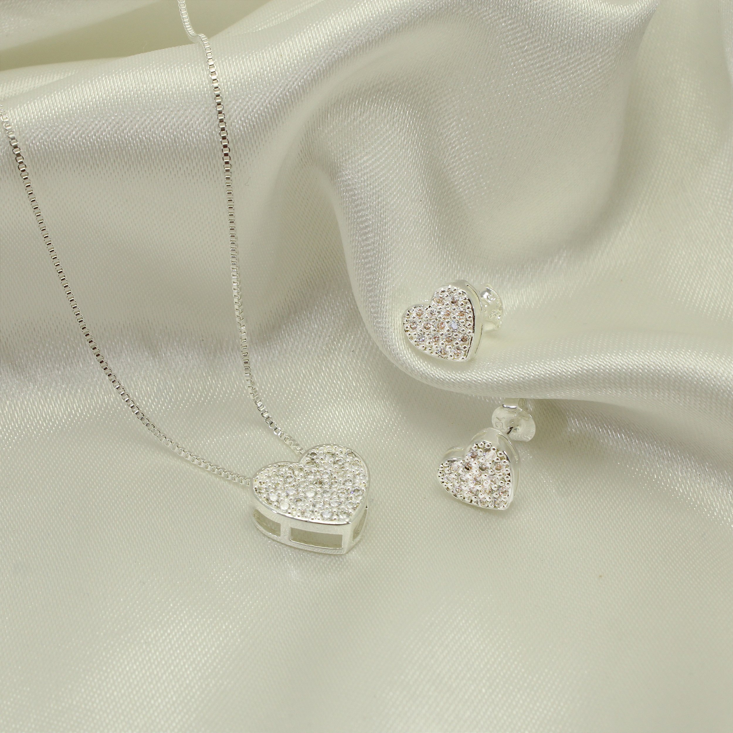 Conjunto de Coração Cravejado em Zircônia Cristal Banhado a Prata