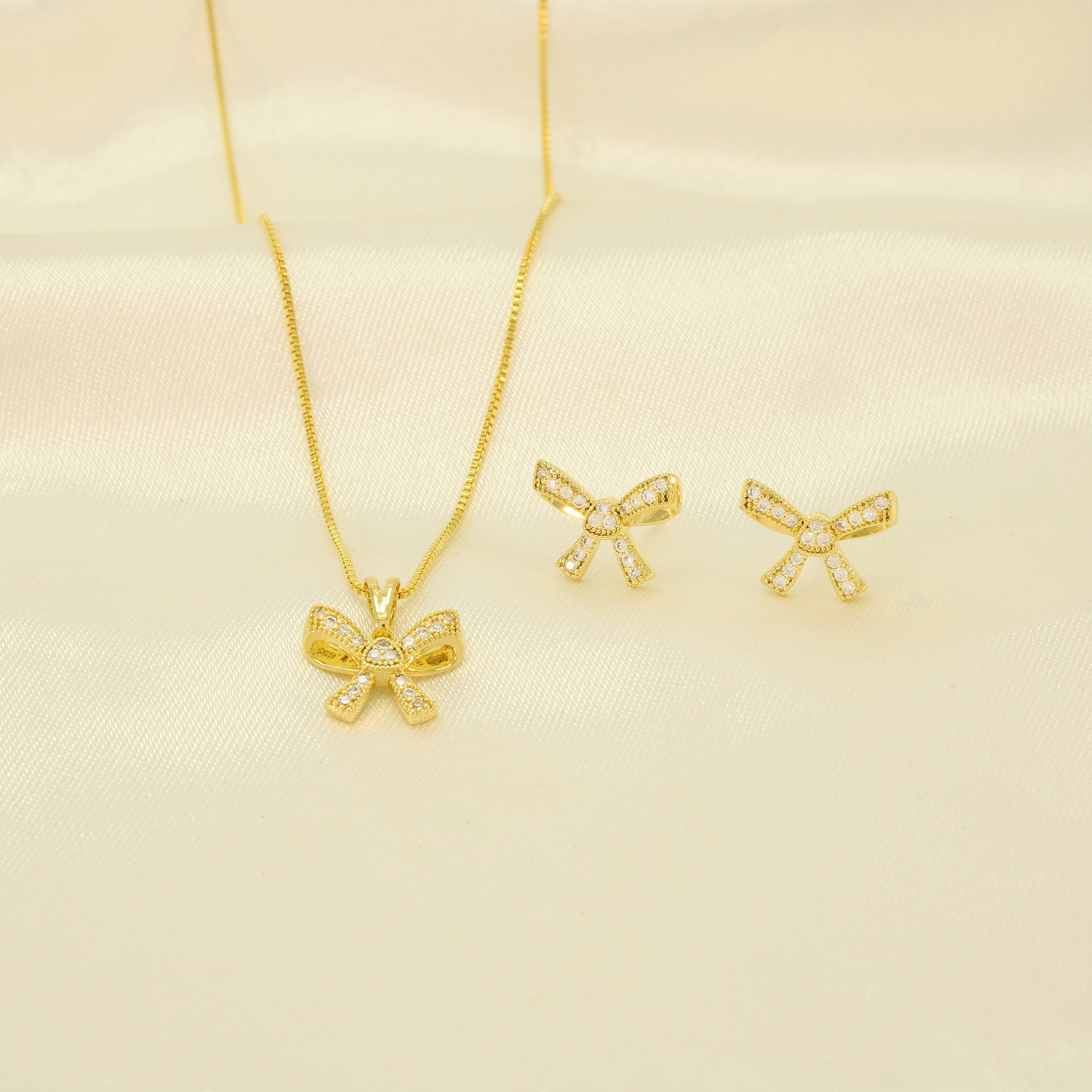 Conjunto de Laço Cravejado em Zircônia Cristal e Banhado a Ouro 18k