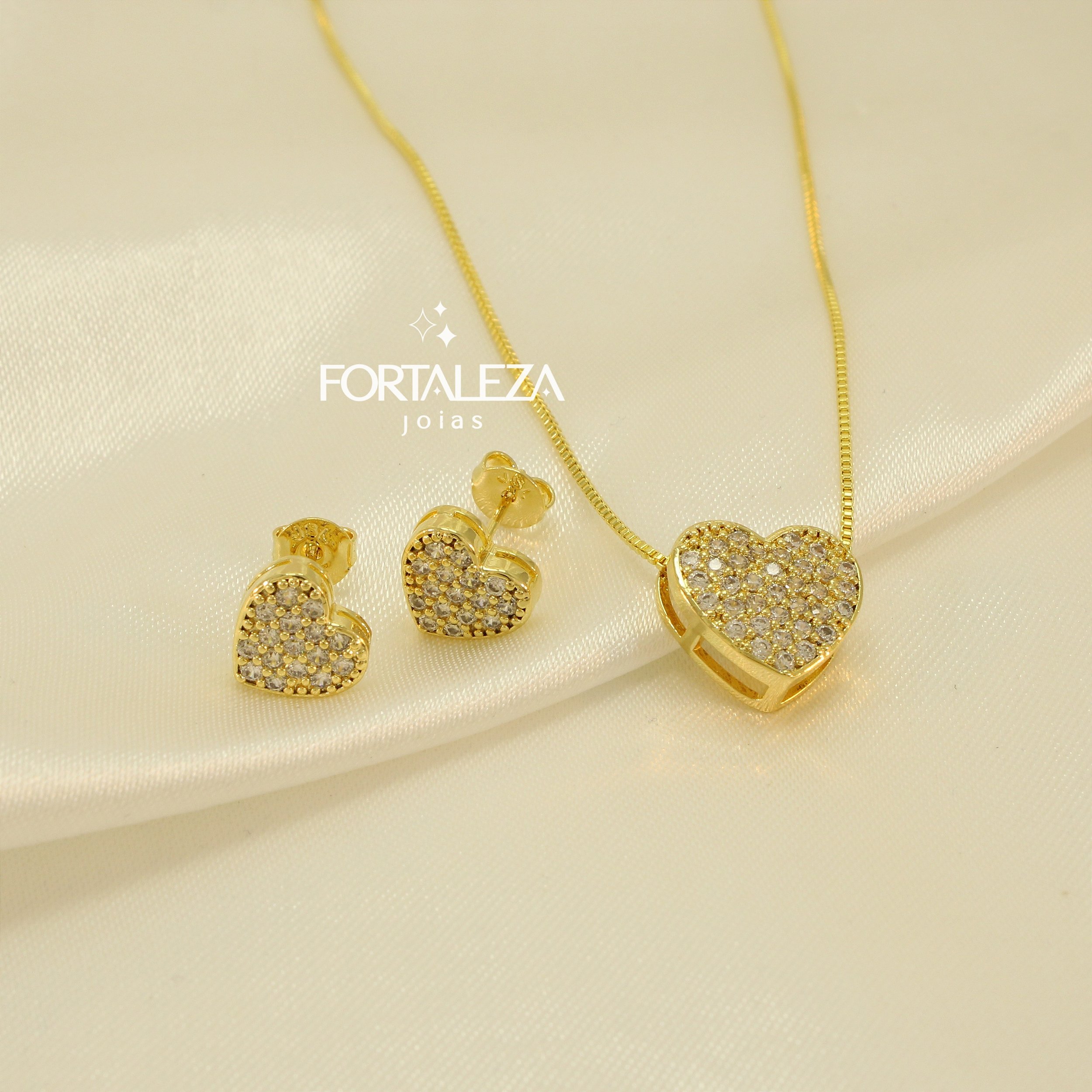 Conjunto Coração Cravejado em Zircônia Cristal Banhado a Ouro 18k