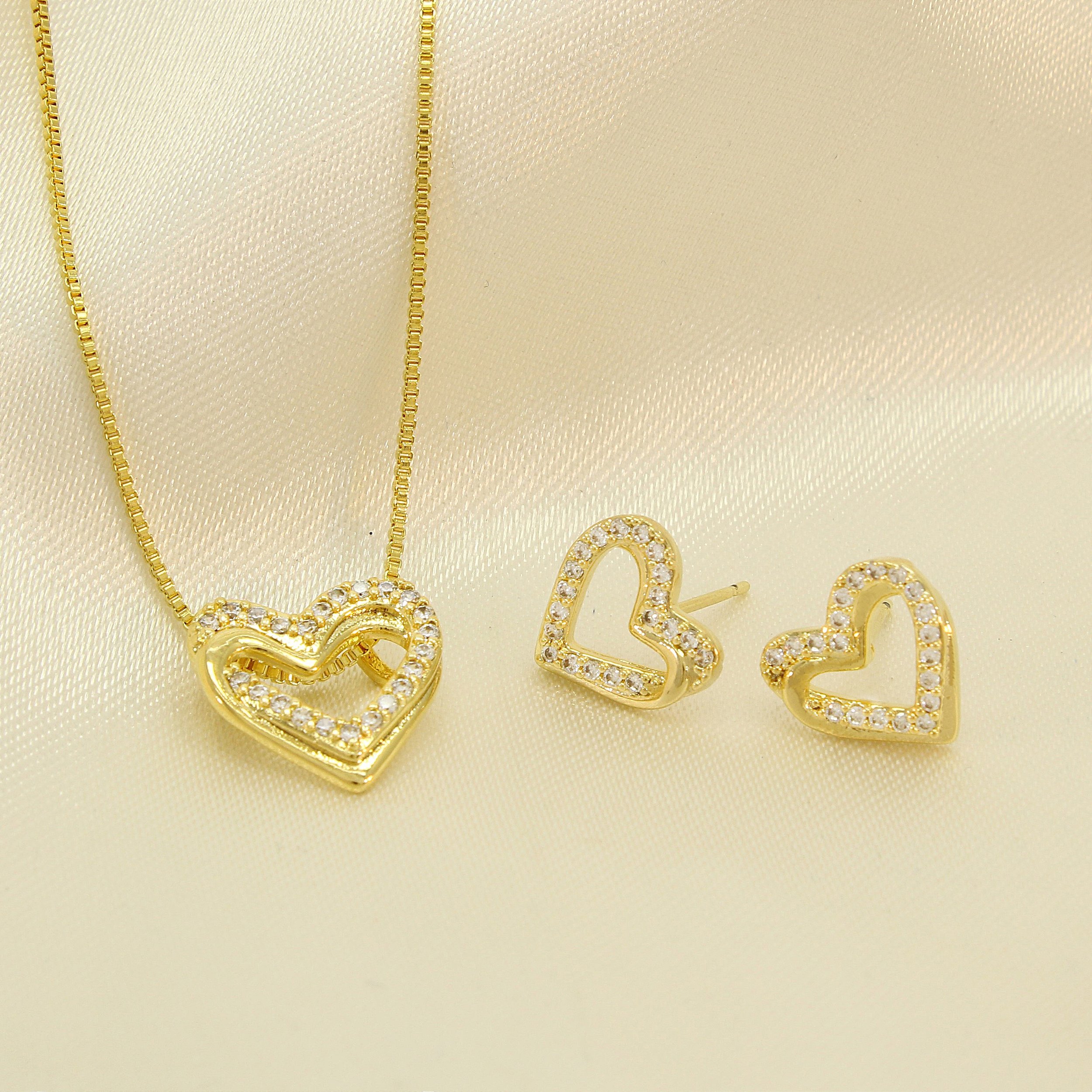 Conjunto de Coração Cravejado em Zircônia Cristal Banhado a Ouro 18k